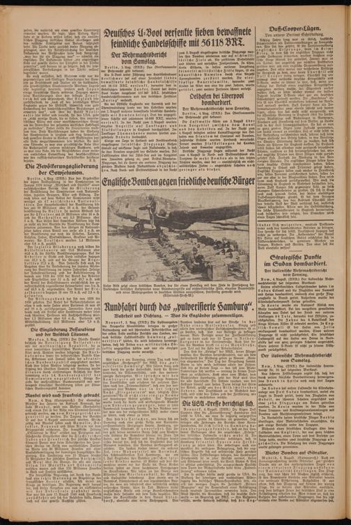 Das sind die Tatsachen, von denen sich am Samstag auch eine große Reihe von Auslands- pressevertretern überzeugen konnte. Hamburg, unsere schöne Elbestadt, ist unversehrt. Das Leben geht seinen normalen Gang. Jetzt zum Wochenende strömen die Bewohner hinaus ins Freie. Im Hafen, auf den Wersten und den Helligen deutet nichts darauf hin, daß sich die Engländer hier seit Monaten bemühen, ihre Bomben wirkungsvoll ab=. zuladen. Sie fanden bisher immer ein anderes Ziel, jene Wohnviertel wie Barmbeck, den dichtbevölkertsten Teil Hamburgs, wo am 3. Juli Engländer ihre Bomben z w i s ch en spielende Kinder warfen. 13 Kinder und drei Erwachsene waren auf der Stelle tot. Neun Kinder starben später an ihren furchtbaren Verletzungen im Krankenhaus. Wir sahen an der Grenze von Alsterdorf jene G r e i s e n a n st a l t, die Krüppel und Epileptiker beherbergt. Hier ebenso wie in Barmbeck, kilometerweit ab von irgendwelchen Bauten die man als industriell oder militärisch wichtig ansprechen könnte, säten sie Tod. Mehrere dieser unglücklichen Greise und einige Krankenschwestern mußte diese Infamie mit dem Tode bezahlen. Wir sahen die Kanalstraße in dem Vorort Uhlenhorst, ebenfalls eine reine Wohngegend. Vier