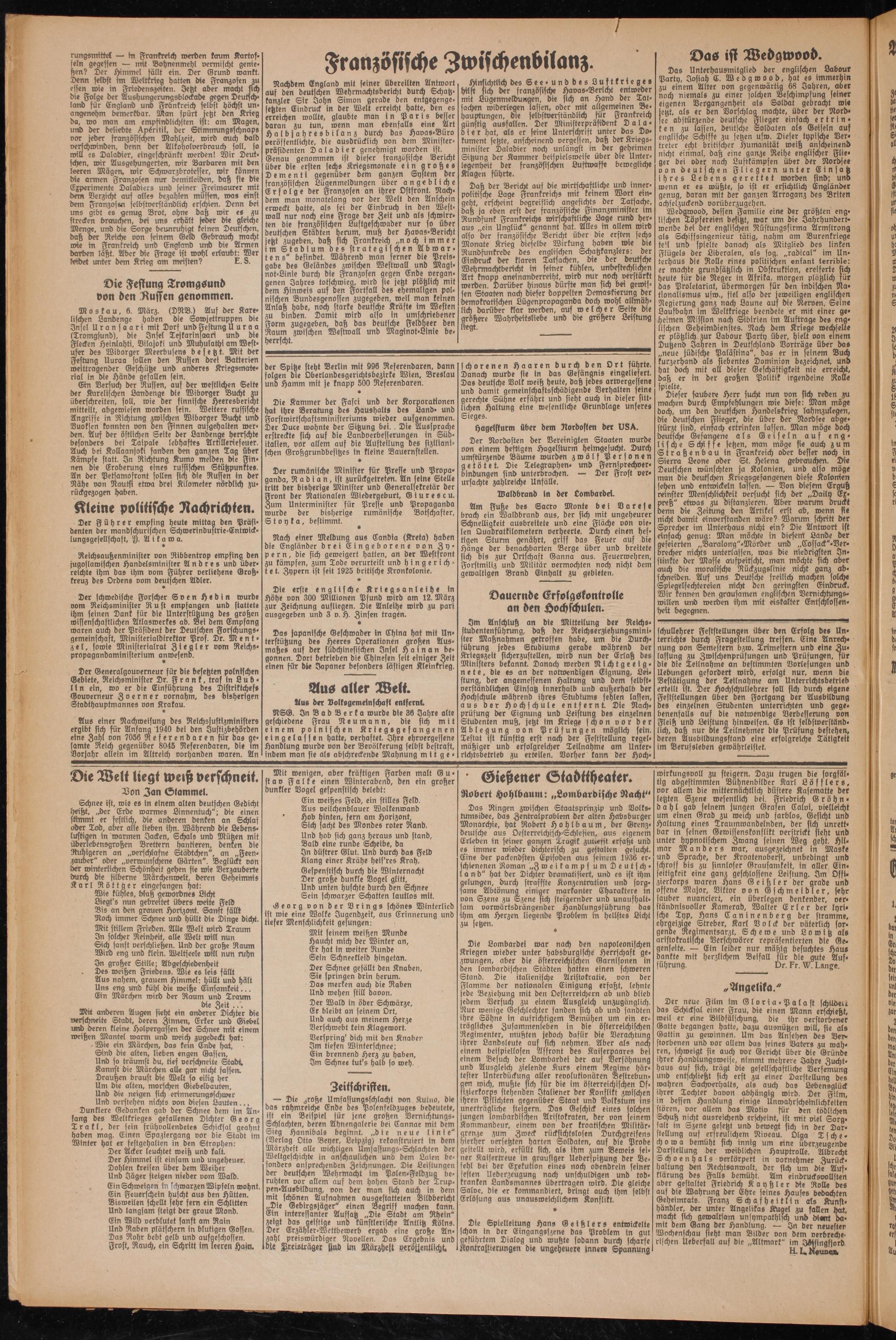 Ein Versuch der Russen, auf der westlichen Seite der Karelischen Landenge die Wiborger Ducht m überschreiten, soll, wie der finnische Heeresbericht mitteilt, abgewiesen worden sein. Weitere russische Angriffe in Richtung zwischen Wiborger Bucht und Vuoksen konnten von den Finnen aufgehalten werden. Auf der östlichen Seite der Landenge herrschte besonders bei Taipale lebhaftes Artille nie feuer. Auch bei Kollaanjoki fanden den ganzen Tag über Kämpfe statt. In Richtung Kümo melden die Finnen die Eroberung eines russischen Stützpunktes. An der Pettamo front sollen sich die Russen in der Nähe von Nautsi etwa drei Kilometer nördlich zurückgezogen haben.