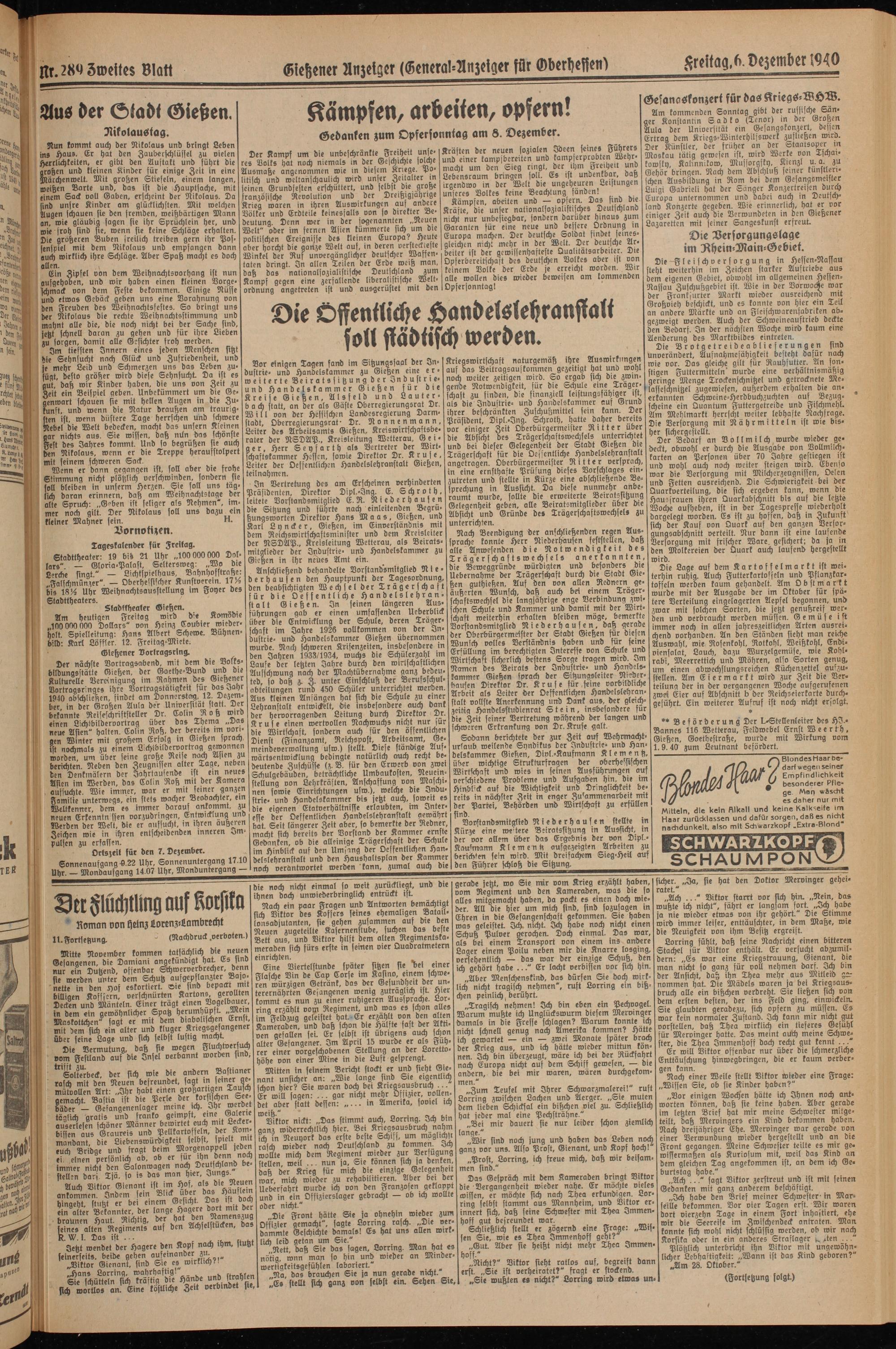 Der nächste Vortragsabend, mit dem die Volksbildungsstätte Gießen, der Goethe-Bund und die Kulturelle Verenigung im Rahmen des Gießener Vortragsringes ihre Vortragstätigkeit für das Jahr 1940 abschließen, findet am Donnerstag, 12. Dezember in der Großen Aula der Universität statt. Der bekannte Reiseschnftsteller Dr. Colin R o ß wird «inen Lichtbilderoortrag über das Thema „Das neue Asien" halten. Colin Roß, der bereits im vori- gen Winter mit großem Erfolg in Gießen sprach ist nochmals zu einem Lichtbildervortrag gewonnen worden, um über seine große Reise nach Asien zu berichten. Neben den Zeugnissen alter Tage, neben den Denkmälern der Jahrtausende ist em neues Men im Werden, das Colin Roß mit der Kamera aufsuchte. Wie immer, war er mit seiner ganzen Familie unterwegs, ein stets wacher Beobachter, em Weltkenner, dem es immer darauf ankommt, zu neuen Erkenntn sfen vorzudringen, Entwicklung unD Werden der Welt, die er anfsucht, m ihren äußeren Zeichen wie in ihren entscheidenden inneren Impulsen zu erfassen.
