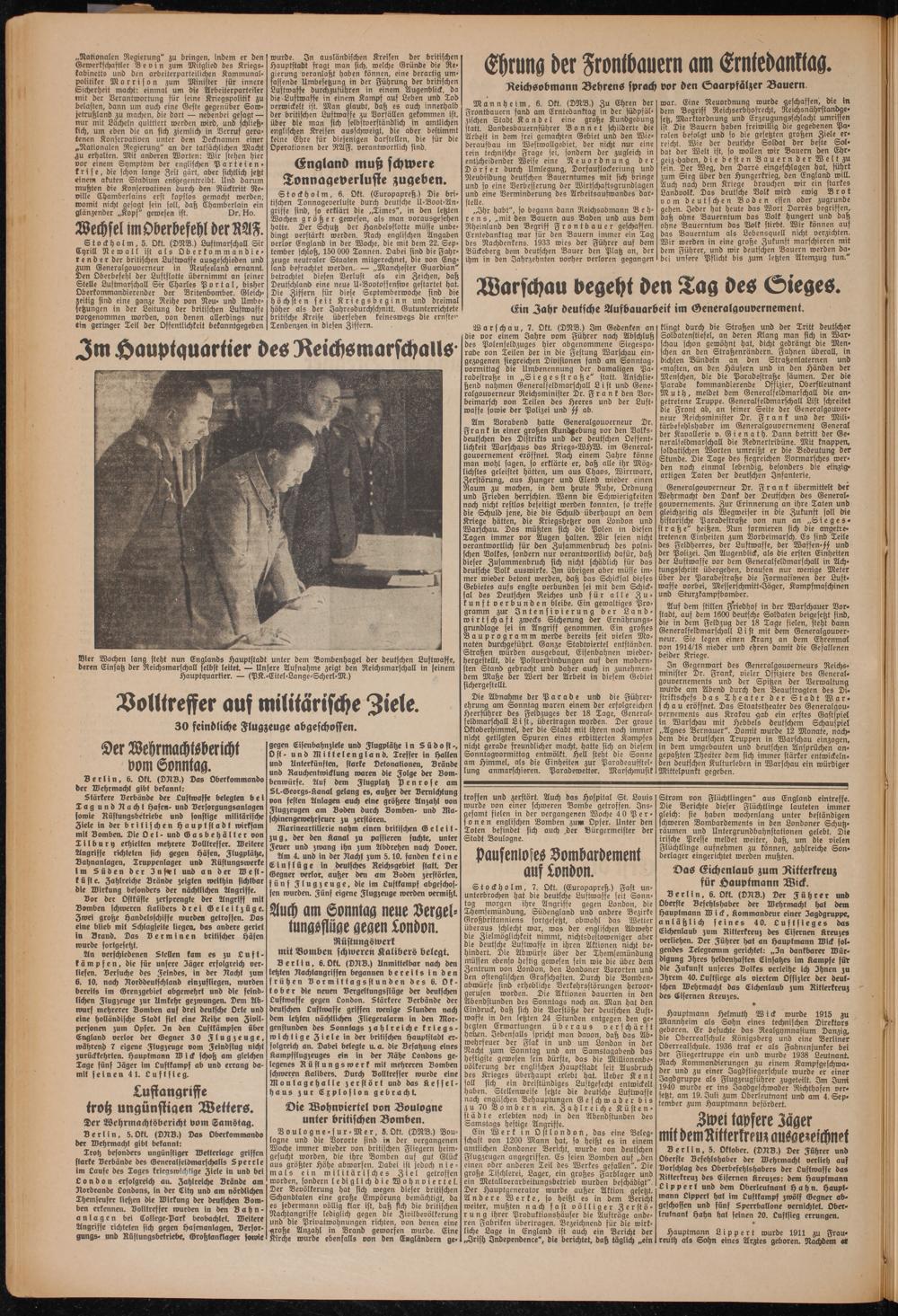 Am 4. und in der Nacht zum 5.10. fanden keine Einflüge in deutsches Reichsgebiet statt. Der Gegner verlor, außer den am Boden zerstörten, fünf Flugzeuge, die im Luftkampf abgefchos- sen wurden. Fünf eigene Flugzeuge werden vermißt. Auch am Sonntag neue Vergel- tungsflüge gegen London.