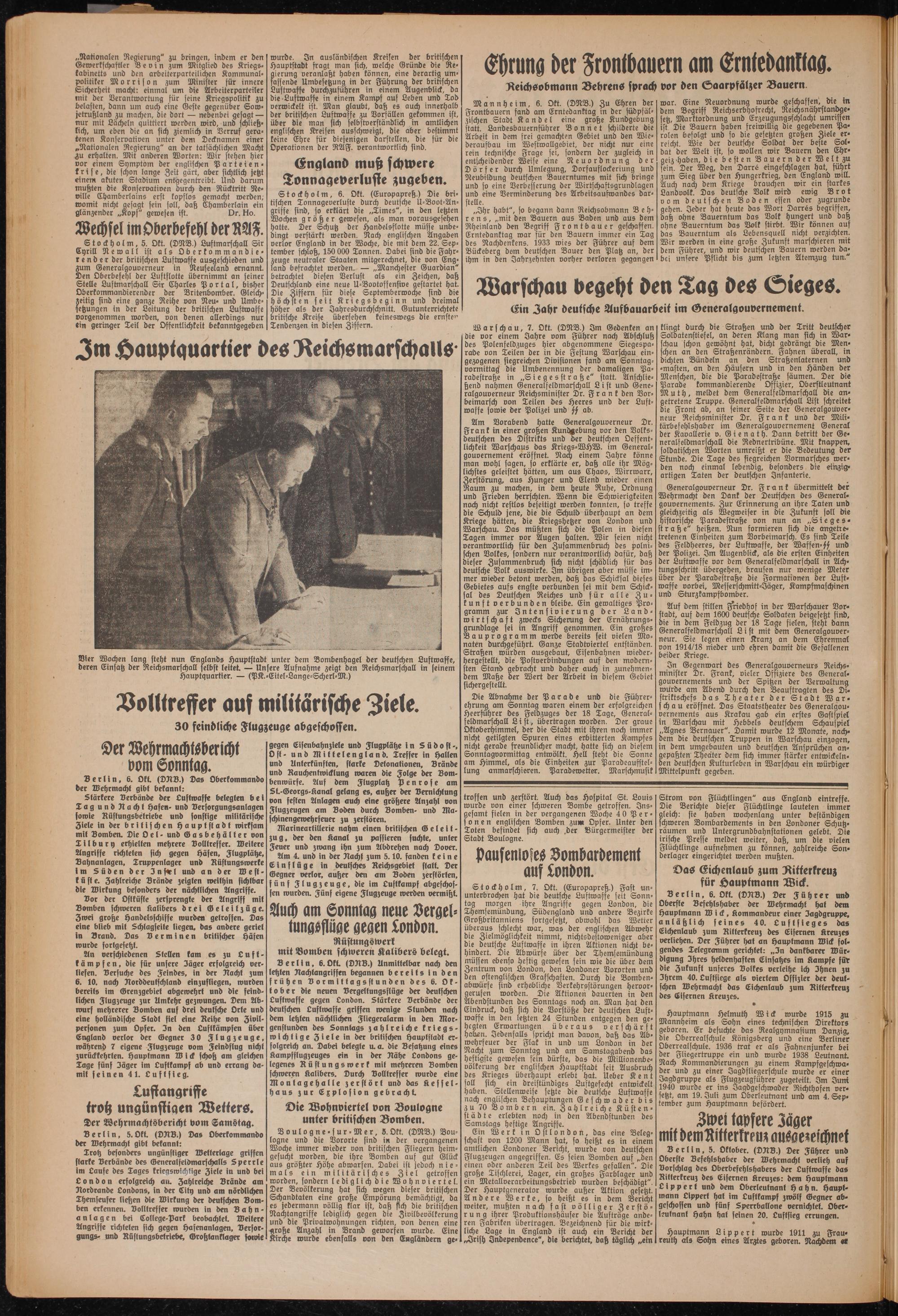 An verschiedenen Stellen kam es zu Luft- kämpfen, die für unsere 3äger erfolgreich verliefen. Versuche des Feindes, in der Nacht zum 6. 10. nach Norddeutschland einzufliegen, wurden bereits im Grenzgebiet abgewehrt und die feindlichen Flugzeuge zur Umkehr gezwungen. Dem Abwurf mehrerer Bomben auf drei deutsche Orte und eine holländische Stadt fiel eine Reihe von Zivilpersonen zum Opfer. 3n den Luftkämpfen über England verlor der Gegner 30 Flugzeuge, während 7 eigene Flugzeuge vom Feindflug nicht zurückkehrten. Hauptmann W i ck schoß am gleichen Tage fünf Jäger im Luftkampf ab und errang damit seinen 41. L u f t s i e g.