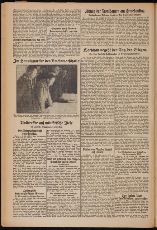 Trotz besonders ungünstiger Wetterlage griffen starke verbände des Generalfeldmarschalls Zperrle im Laufe des Tages kriegswichtige Ziele in und bei London erfolgreich an. Zahlreiche Brände am Nordrande Londons, in der City und am nördlichen Themseufer liehen die Wirkung der deutschen Bomben erkennen. Volltreffer wurden in den Bahnanlagen bei College-Park beobachtet. Weitere Angriffe richteten sich gegen Hasenanlagen, Versor- gungs- und Rüftungsbetriebe, Großtanklager sowie