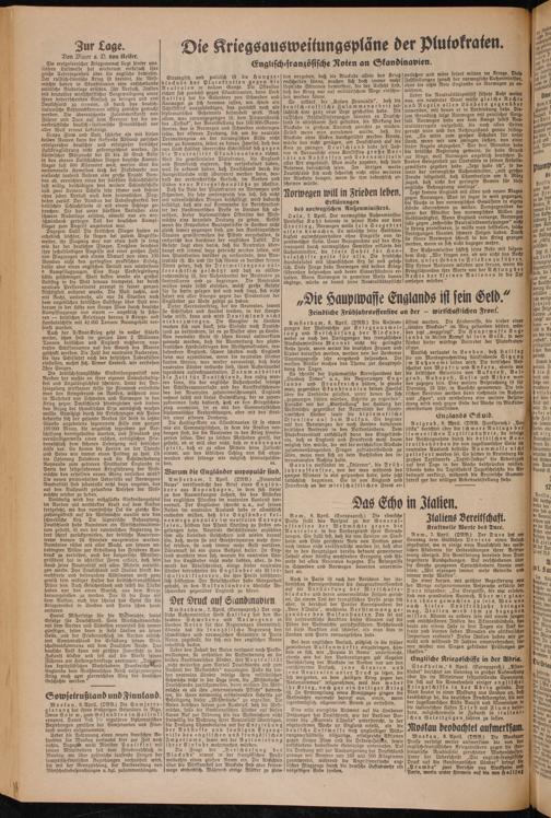 Die britisch-französische Einkreisungspolitik von Norden her mußte an ihrer eigenen Unwahrhaftig- keit und Unzulänglichkeit scheitern. Unter der Vorspiegelung wirksamer Hilfe für Finnland entfesselte man den Kriegsbrand im Norden, während man in Wahrheit nur Schweden und Norwegen in den Krieg gegen Deutschland hineinziehen und diesem den Bezug der schwedischen Erze unmöglich machen wollte. Gewitzigt durch die Erfahrungen mit Polen -bedankte sich der gesamte Norden für diese in letzter Stunde angebotene sogenannte Hilfe von ganzen 100 000 Mann, die angeblich irgendwo zur Verschiffung bereitgehalten wurden, und Finnland zog vernünftigerweise einen raschen, erträglichen Friedensschluß dem sicheren Untergang mit britischer Hilfe vor. So kamen die Herren an der Themse Posttag zu spät. Ob die Schilderhebung