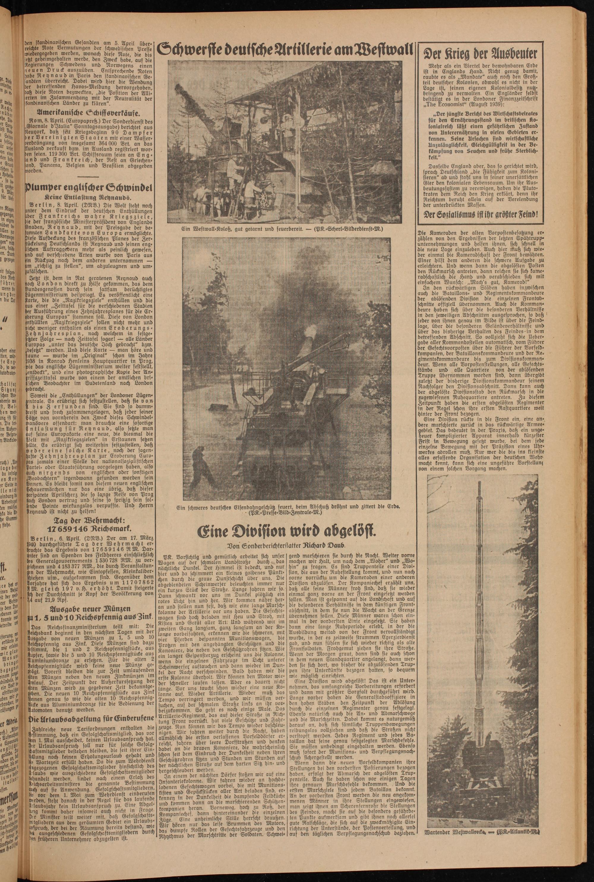 I Sas Reichsfinanzministerium teilt mit: Die Reichsbank beginnt in den nächsten Tagen mit der Ausgabe von neuen Münzen zu 1, 5 und 10 ; Reichspfennig aus Zink. Diese Münzen sind dazu bcstimmt, die 1 und 2 Reichspfennigstucke aus Kupfer, sowie die 5 und 10 Reichspfennigstucke aus Aluminiumbronze zu ersetzen. Für die alten 2 i: Reichspfennigstücke wird keine neue Münze geprägt. Vorerst bleiben die zur Zeit umlaufenden alten Münzen neben den neuen Zinkmünzen im Umlauf. Der Zeitpunkt der Außerkurssetzung der alten Münzen wird zu gegebener Zeit bekanntge- glben. Die neuen 10 Reichspfennigstücke aus Zink können genau so wie die alten 10 Reichspfenmg- ftiicfe aus Aluminiumbronze für die Bedienung der Automaten benutzt werden.