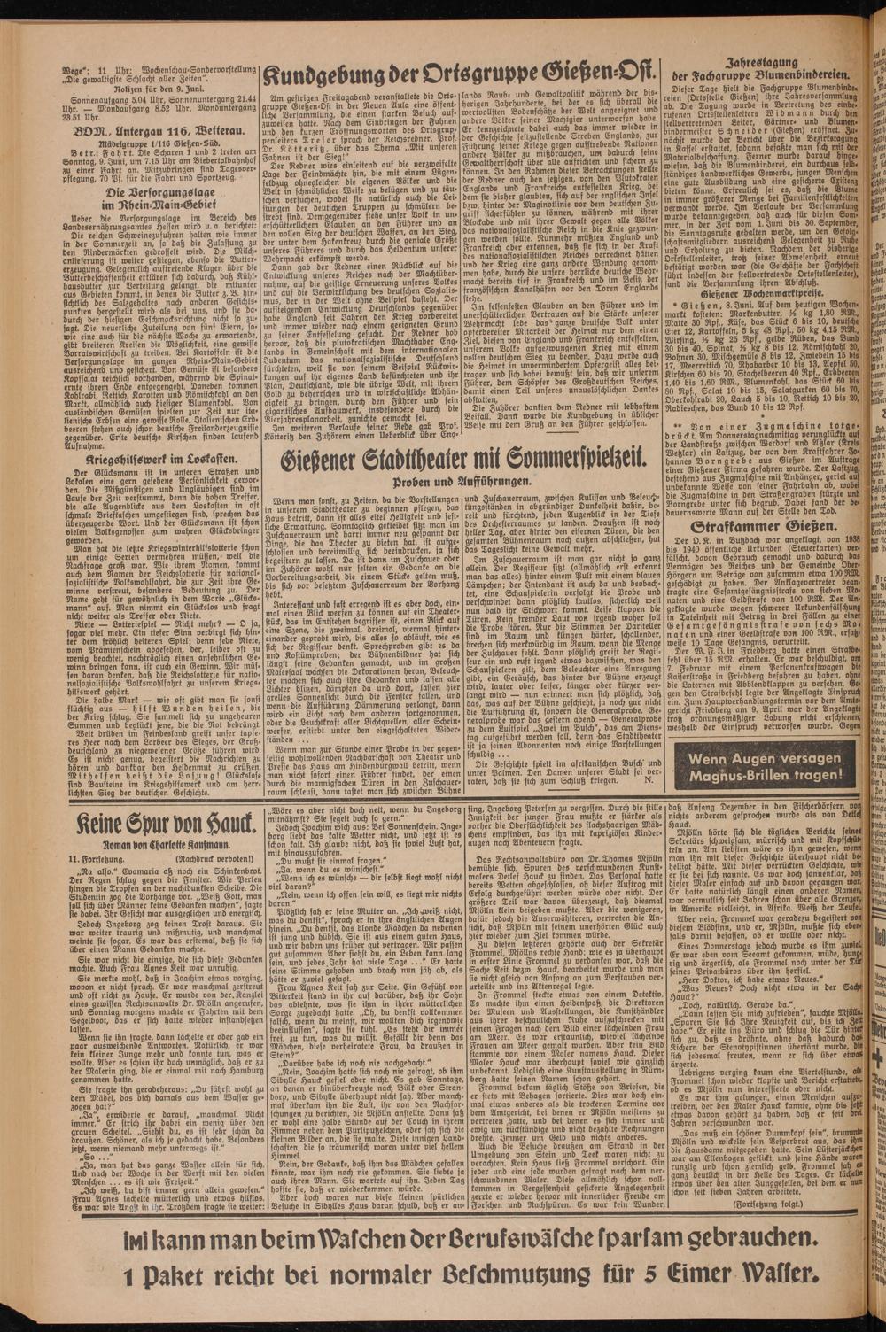 Am gestrigen Freitagabend veranstaltete die Ortsgruppe Gießen-Ost in der Neuen Aula eine öffentliche Versammlung, die einen starken Besuch aufzuweisen hatte. Nach dem Einbringen der Fahnen und den kurzen Eröffnungsworten des Ortsgrup- penleiters Treser sprach der Reichsredner, Prof. Dr. Kötteritz, über das Thema „Mit unseren Fahnen ist der Sieg!" .