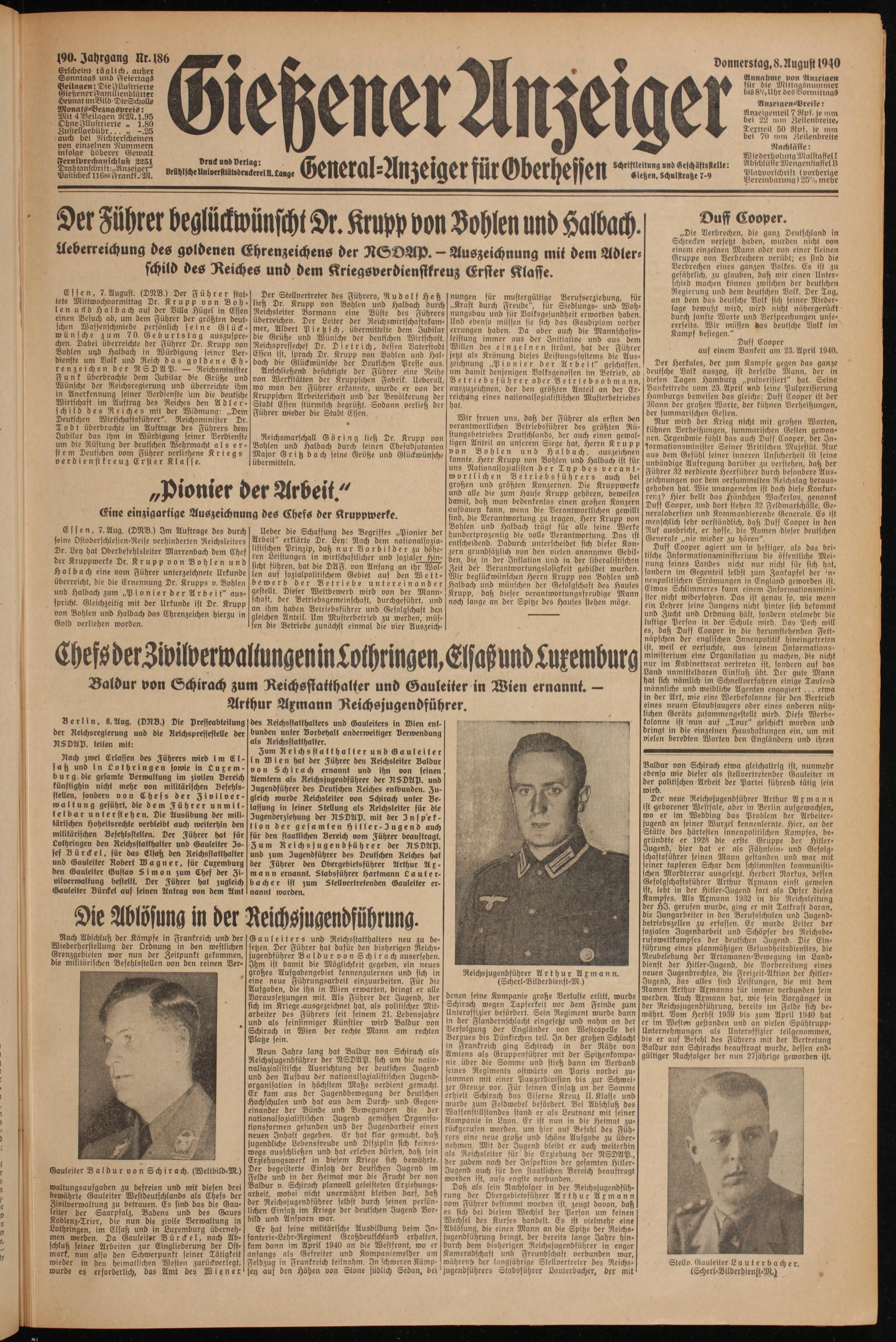 Zum Reichs st atthaller und Gauleiter in Wien hat der Führer den Reichsleiter Baldur von Schirach ernannt und ihn von seinen Aemtern als Reichsjugendführer der NSDAP, und Jugendführer des Deutschen Reiches entbunden. Zugleich wurde Reichsleiler von Schirach unter Belassung in seiner Stellung als Reichsleiter für die Jugenderziehung der NSDAP, mit der Inspektion der gesamten Hitler-Jugend auch für den staatlichen Bereich vom Führer beauftragt. Zum Reichsjugend f-ührer der NSDAP, und zum Jugendführer des Deutschen Reiches hat der Führer den Obergebietsführer Arthur Axmann ernannt. Stabsführer Hartmann Lauterbacher ist zum Stellvertretenden Gauleiter ernannt worden.