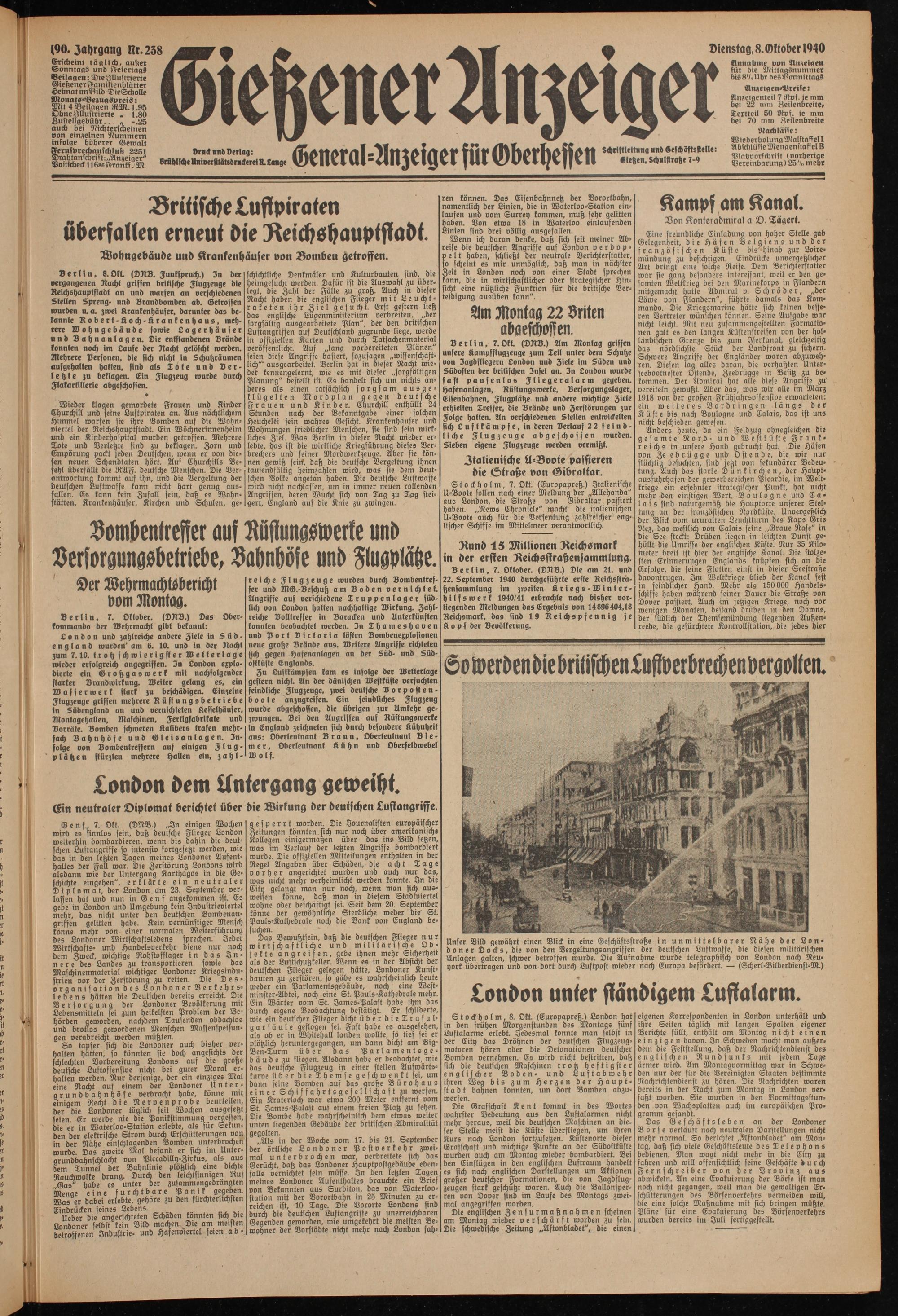 Berlin, 7.Oft (DRB.) Am Montag griffen unfere Kampfflugzeuge zum Teil unter dem Schuhe von 3agbftiegern London und Ziele im Süden und Südosten der britischen 3nfel an. 3n London wurde fast pausenlos Fliegeralarm gegeben. Hafenanlagen, Rüstungswerke. Versorgungslager, Eisenbahnen, Flugplätze und andere wichtige Ziele erhielten Treffer, die Brände und Zerstörungen zur Folge hatten. An verschiedenen Stellen entwickelten sich Luftkämpfe, in deren Verlauf 22 feindliche Flugzeuge abgeschossen wurden. Sieben eigene Flugzeuge werden vermißt.