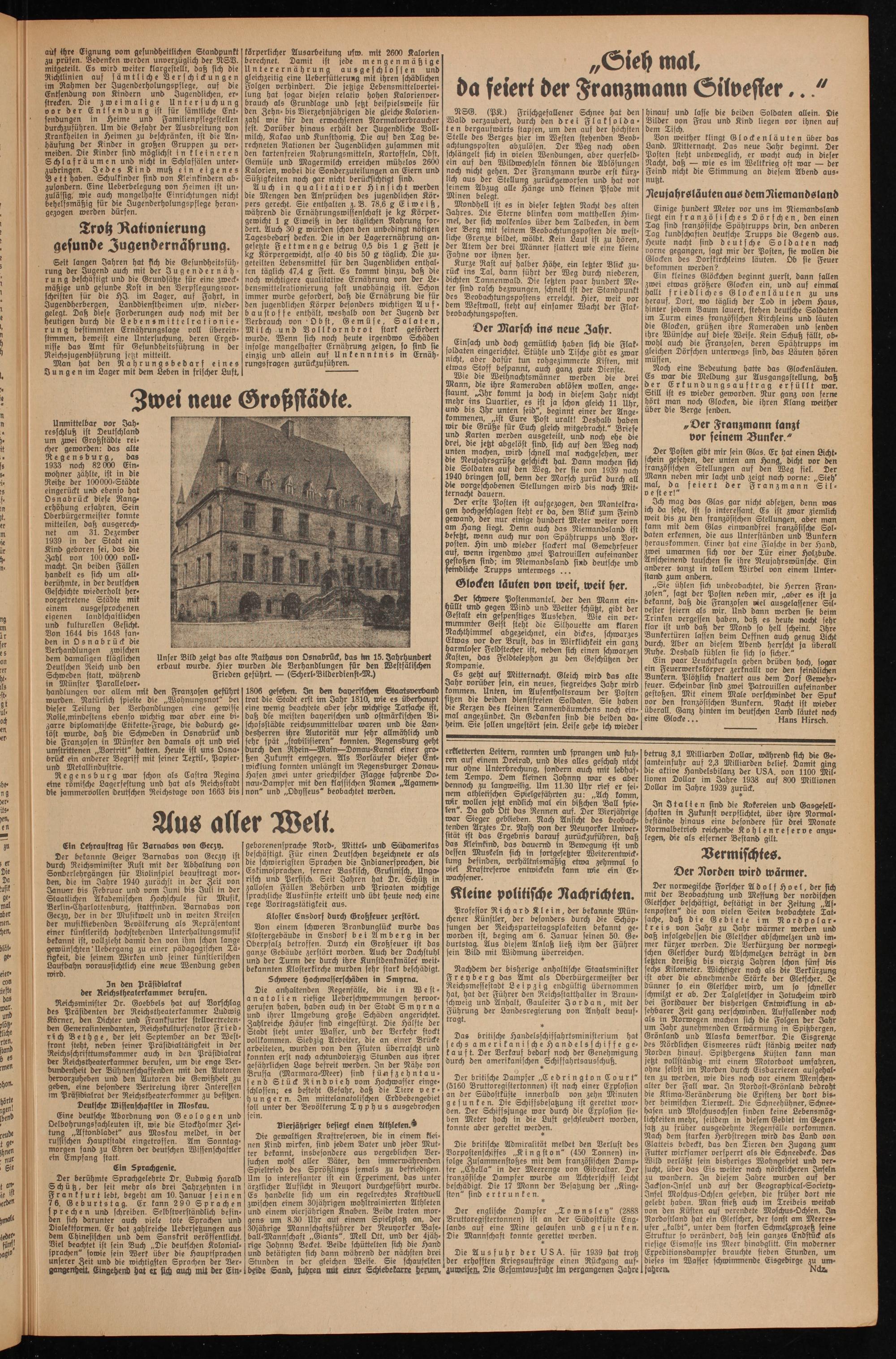 Unmittelbar vor Jahresschluß ist Deutschland um zwei Großstädte reicher geworden: das alte Regensburg, das 1933 noch 82 000 Einwohner zählte, ist in die Reihe der 100000-Städte eingerückt und ebenso hat Osnabrück diese Rang? erhöhung erfahren. Sein Oberbürgermeister konnte mitteilen, daß ausgerechnet am 31. Dezember 1939 in der Stadt ein Kind geboren sei, das die Zahl von 100 000 Vollmacht. In beiden Fällen handelt es sich um altberühmte, in der deutschen Geschichte wiederholt her- oorgetretene Städte mit einem ausgesprochenen eigenen landschaftlichen und kulturellen Gesicht. Von 1644 bis 1648 fanden in Osnabrück die Verhandlungen zwischen dem damaligen kläglichen Deutschen Reich und den Schweden statt, während in Münster Parallelver-