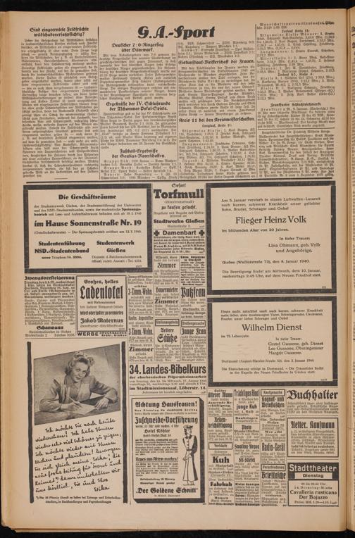 des Studenten werk Gießen, der Studentenführung der Universität und des NSD.-Studentenbundes, sowie der studentische Speisungsbetrieb mit Lese- und Aufenthaltsraum befinden sich ab 10.1.1940