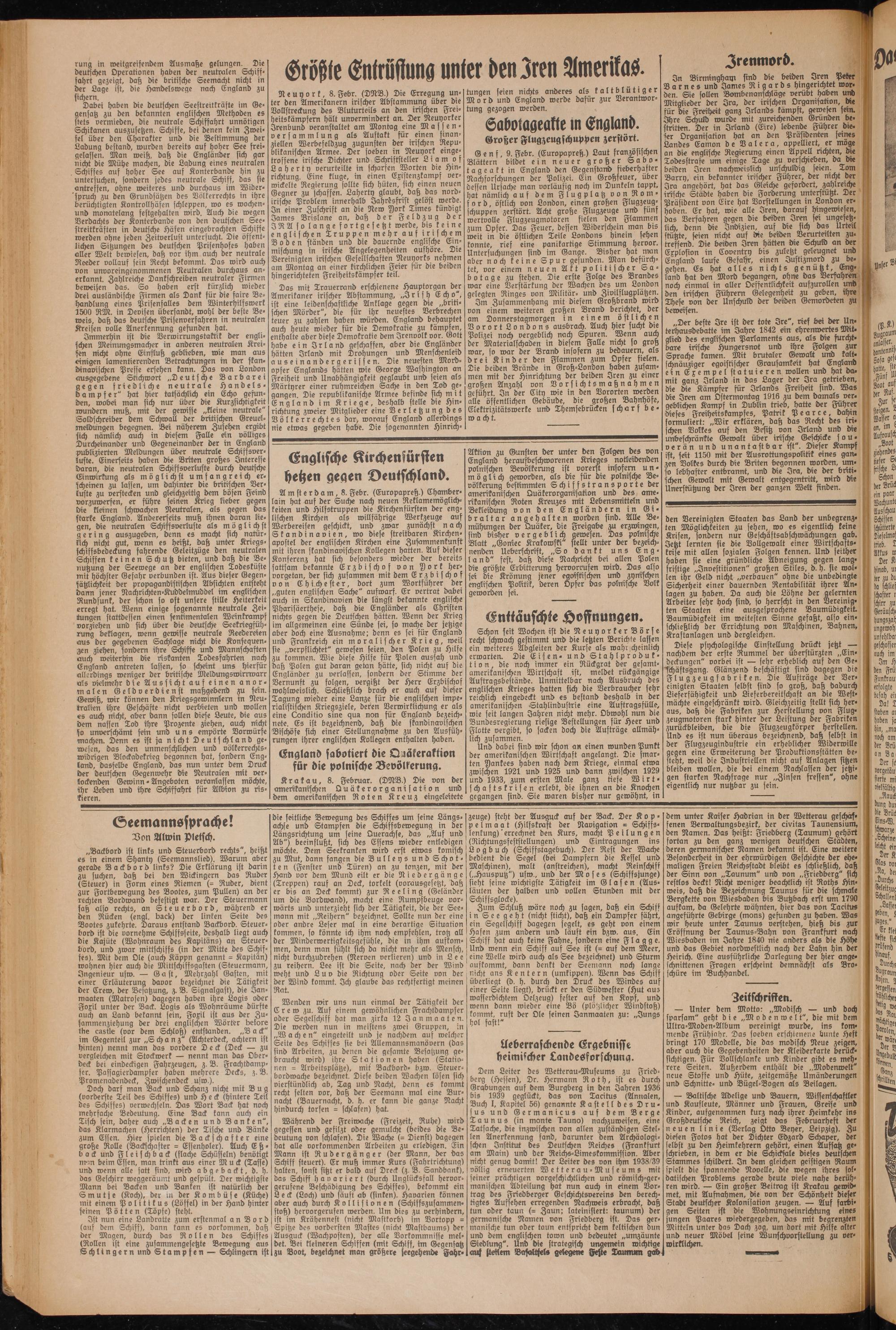 Neuyor k, 8. Febr. (DNB.) Die Erregung unter den Amerikanern irischer Abstammung über die Vollstreckung des Bluturteils an den irischen Freiheitskämpfern hält unvermindert an. Der Neuyorker Ärenbund veranstaltet am Montag eine Massenversammlung als Auftakt für einen finanziellen Werbefeldzug zugunsten der irischen Republikanischen Armee. Der soeben in Neuyork eingetroffene irische Dichter und Schriftsteller Liam o f L a h e r t y verurteilte in scharfen Worten die Hinrichtung. Eine kluge, in einen Existenzkampf verwickelte Regierung sollte sich hüten, sich einen neuen Gegner zu schaffen. Laherty glaubt, daß das nord- irische Problem innerhalb Jahresfrist gelöst werde. In einer Zuschrift an die New York Times kündigt James Brislane an, daß der Feldzug der IRA so lanqe fortgesetzt werde, bis keine englischen Truppen mehr auf irischem Boden ständen und die dauernde englische Einmischung in irische Angelegenheiten aufhöre. Die Vereinigten irischen Gesellschaften Neuyorks nehmen am Montag an einer kirchlichen Feier für die beiden Hingerichteten Freiheitskämpfer teil.