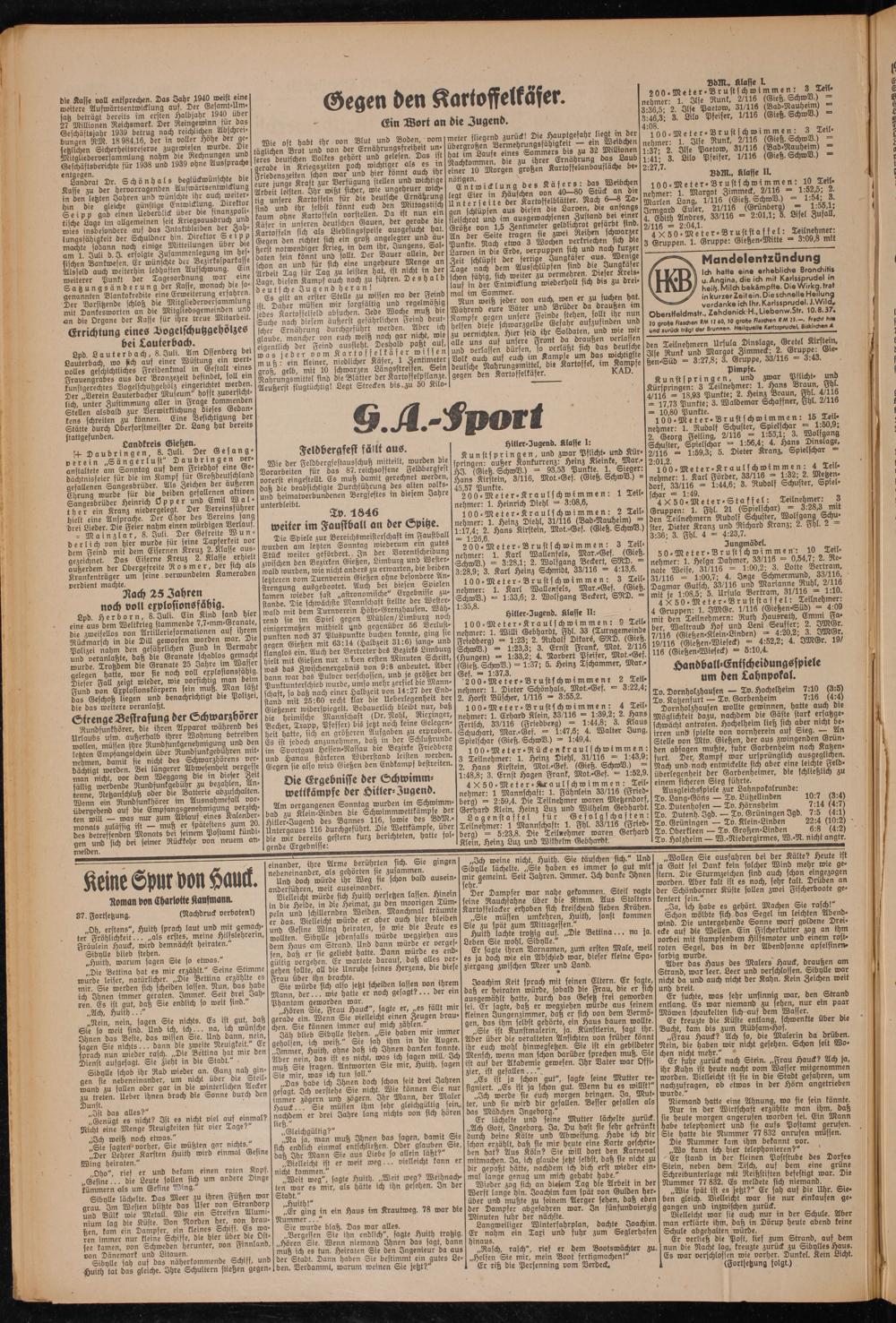 Wie oft habt ihr von Blut und Boden, vom täglichen Brot und von der Ernährungsfreiheit unseres deutschen Volkes gehört und gelesen. Das ist gerade in Kriegszeiten poch wichtiger als es m Friedenszeiten schon war und hier„könntauch ihr eure junge Kraft zur Verfügung stellen und wichtige Arbeit leisten. Ähr wißt sicher, wie ungeheuer wichtig unsere Kartoffeln für die deutsche Ernährung sind und ihr selbst könnt euch den Mittagstisch kaum ohne Kartoffeln vorstellen. Da ist nun ein Käfer in unseren deutschen Gauen, der gerade die Kartoffeln sich als Lieblingsspeise ausgesucht hat. Gegen den richtet sich ein groß angelegter und au- Herst notwendiger Krieg, m dem ihr, Jungens, Soldaten sein könnt und sollt. Der Bauer allem, der schon an und für sich eine ungeheure Menge an Arbeit Tag für Tag zu lösten hat ist Nicht m ber Lage, diesen Kampf auch noch zu fuhren. Deshalb deutsche Jugend heran!
