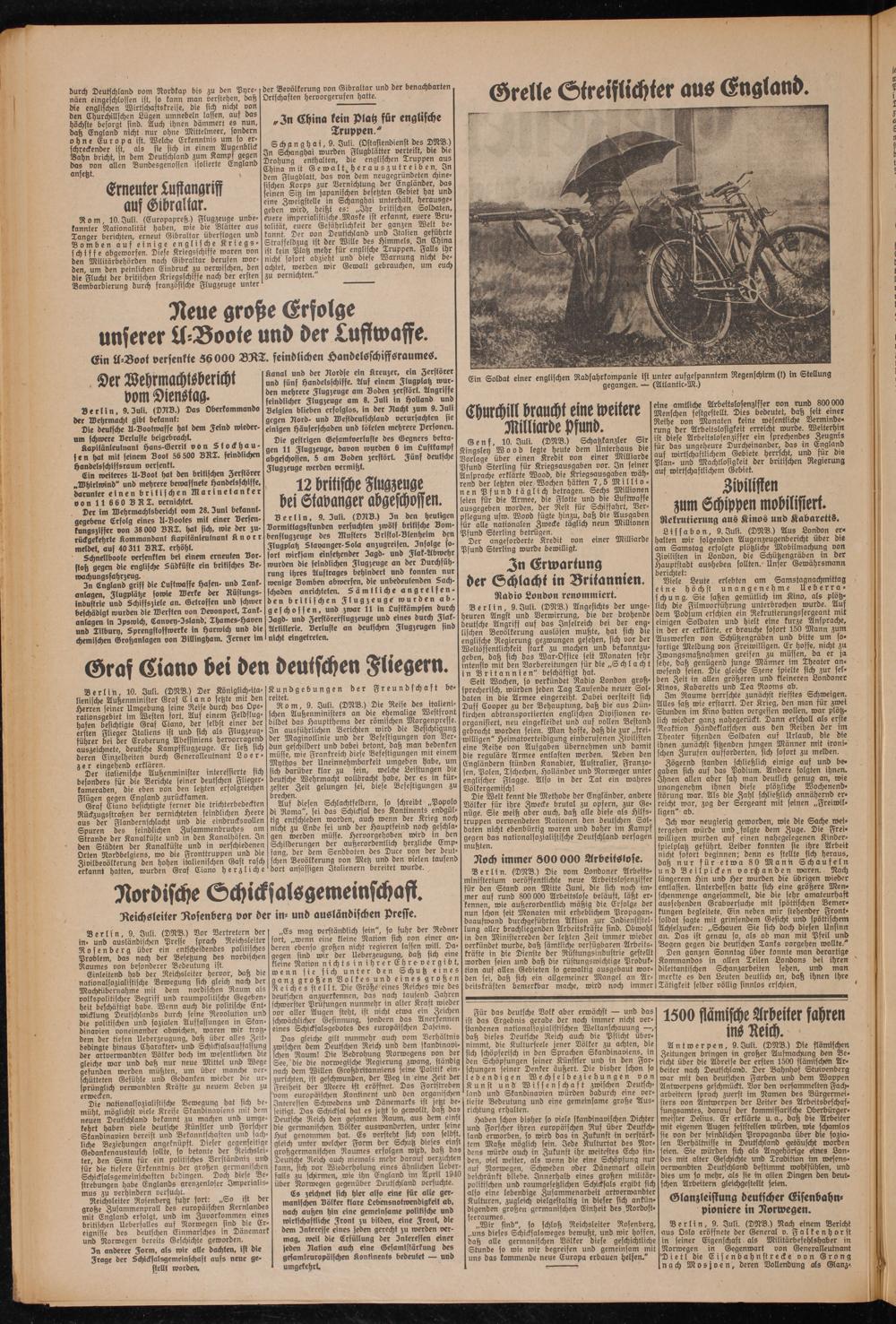 Kanal und der Rordse ein Kreuzer, ein Zerstörer und fünf Handelsschiffe. Auf einem Flugplatz wurden mehrere Flugzeuge am Boden zerstört. Angriffe feindlicher Flugzeuge am 8. Juli in Holland und Belgien blieben erfolglos, in der Rächt zum 9. Juli gegen Rord- und Westdeutschland verursachten sie einigen Häuserschaden und töteten mehrere Personen.
