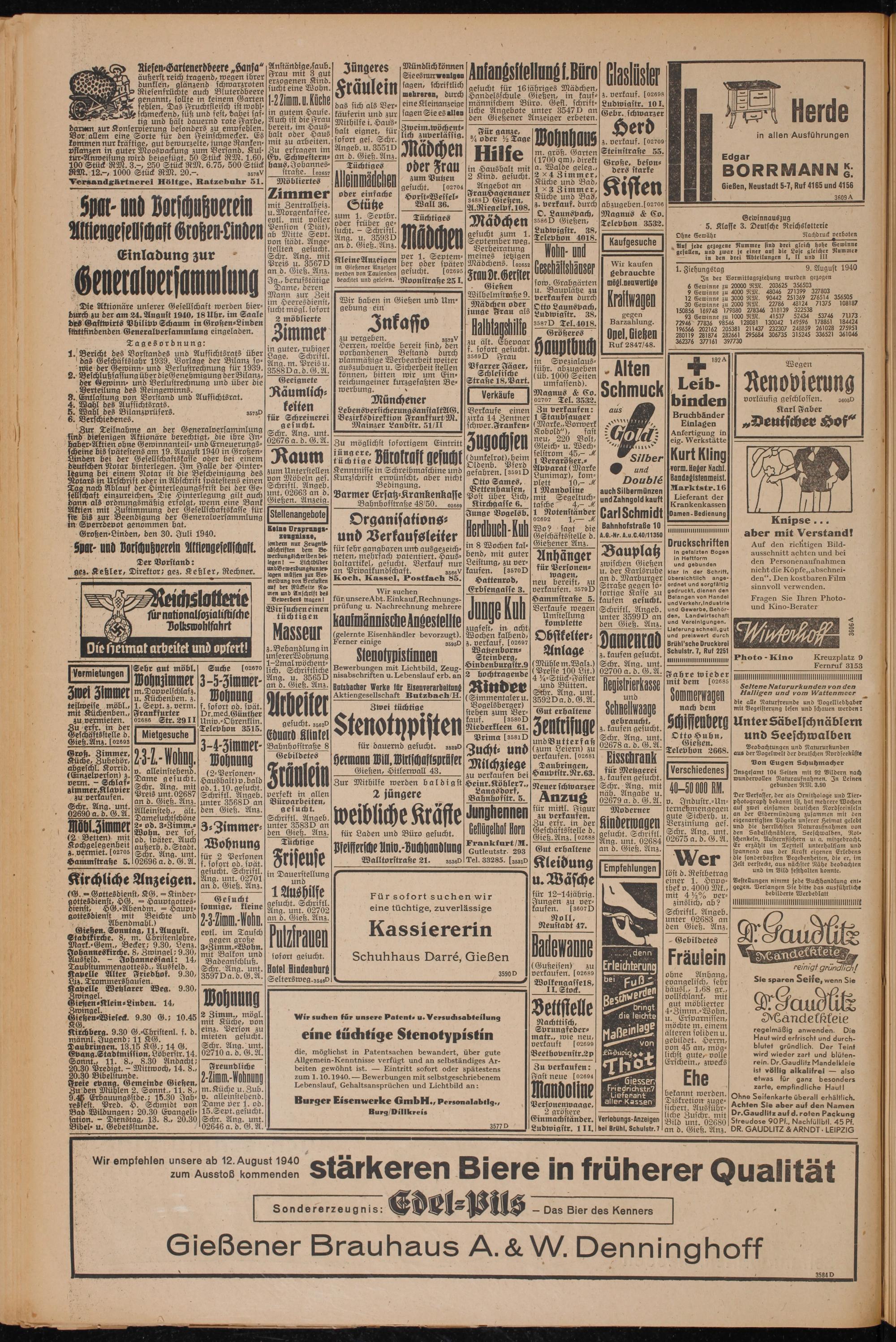 Die Aktionäre unserer Gesellschaft werden hierdurch zu der am 24. August 1940,18 Uhr, im Saale dies Gastwirts Philipp Schaum in Großen-Linden stkttfindenden Generalversammlung eingeladen.