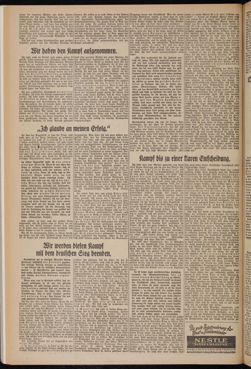 Und endlich, ich habe noch den großen Krieg mitgemacht, und ich gehöre auch zu denen, die damals um den Erfolg betrogen worden sind. Und es ist daher mein unerschütterlicher Entschluß, daß dieser Kampf nicht so ausgeht wie damals.
