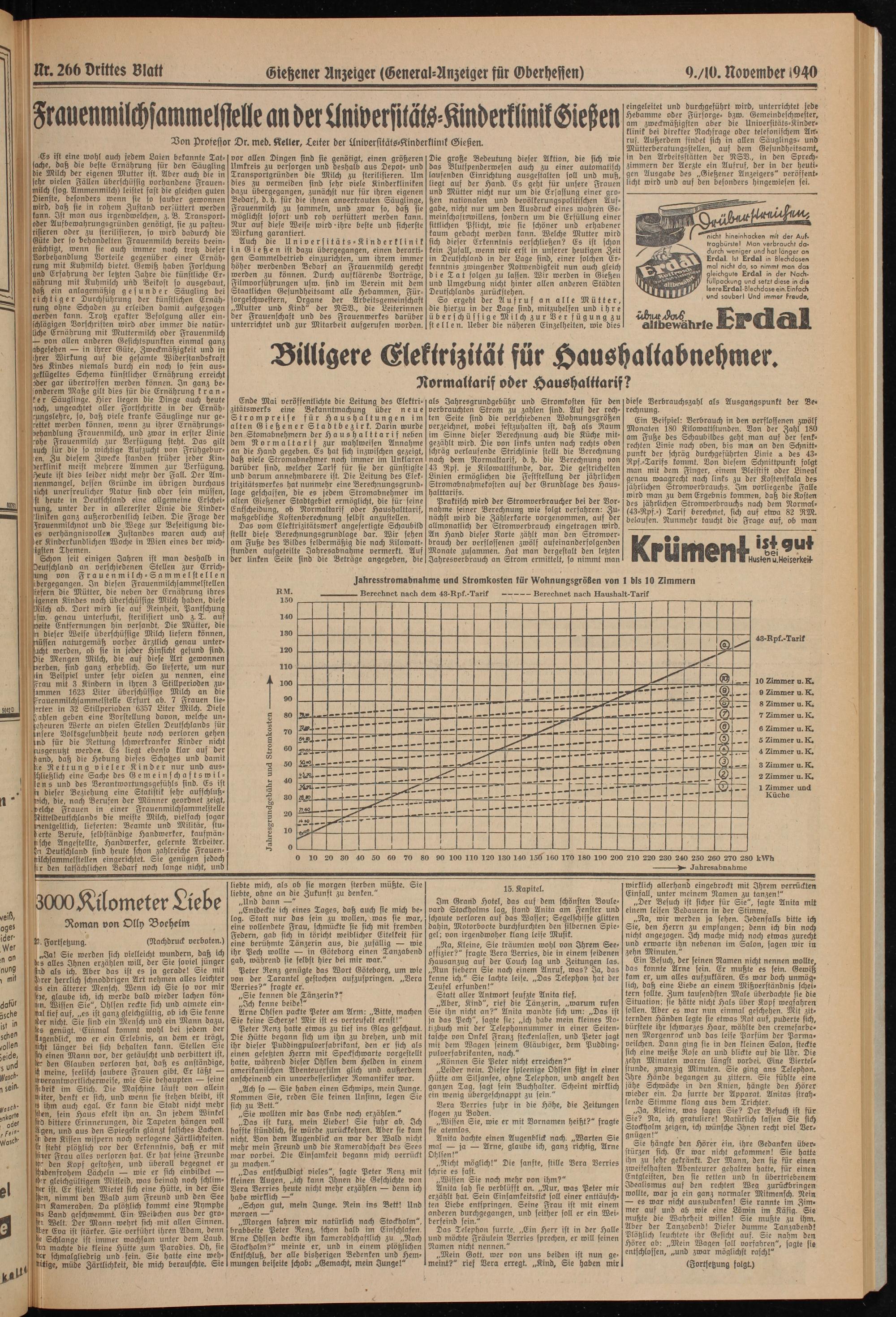 Ende Mai veröffentlichte die Leitung des Elektrizitätswerks eine Bekanntmachung über neue Strompreise für Haushaltungen im alten Gießener Stadtbezirk. Darin wurde den Stornabnehmern der Haushalttarif neben dem Normaltarif zur wahlweisen Annahme an die Hand gegeben. Es hat sich inzwischen gezeigt, daß viele Stromabnehmer noch immer im Unklaren darüber sind, welcher Tarif für sie der günstigste und darum annehmbarere ist. Die Leitung des Elektrizitätswerkes hat nunmehr eine Berechnungsgrundlage geschaffen, die es jedem Stromabnehmer im alten Gießener Stadtgebiet ermöglicht, die für feine Entscheidung, ob Normaltarif oder Haushalttarif, maßgebliche Kostenberechnung selbst anzustellen.
