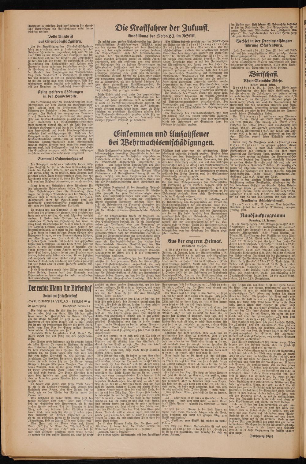6 Uhr: Morgengruß. 6.10: Morgengymnastik. 6.30: Frühkonzert. 7 bis 7.15: Nachrichten. 8: Landvolk, merk' auf! 8.10: Gymnastik. 9.15: Deutschland — Kin- derland: „Kinderbriefe". 9.30: Frohe Weisen. 11: Blasmusik. Ausführung: Das Musikkorps eines Flak» Regiments. 11.50: Stadt unb Land — Hanb in Hand. 12: Mittagskonzert. Es spielt bas große Orchester des Reichssenders Frankfurt. 12.30 bis 12.40: Nachrichten. 13: Von Wien: Mittagskonzert. 14: Nachrichten. 14.15: Der fröhliche Lautsprecher. 16: Klingende Liebesgaben (33). Eine fröhliche Sendung des Reichssenders Frankfurt für die Kameraden am Westwall. In Verbindung mit der NS.-Gerneinfchaft „Kraft durch Freude". 17 bis 17.10: Nachrichten. 18: Bühne unb Film im Runbfunk. 18.25: Zum frohen Wochenenbe. Dazwischen: 18.30: Aus bem Zeitgeschehen. 19.10: Berichte. 19.45: Politische Zeitungsschau. 20: Nachrichten. 20.15: Übertragung vom Deutschlanbsenber: Dazwischen: 22 bis 22.15: Nachrichten. 24 bis 0.15: Nachrichten.