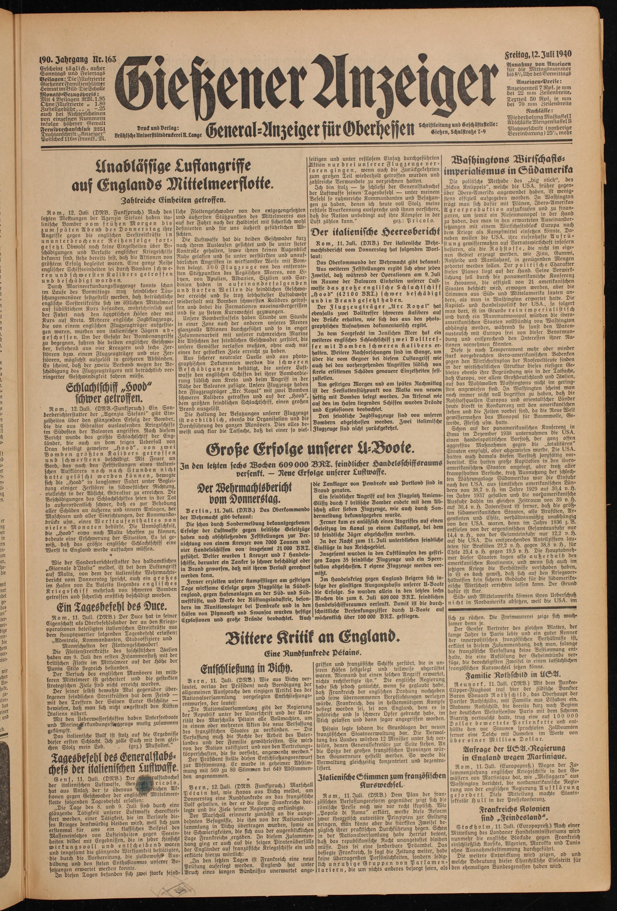 Freitag, 12. Juli 1940 Annahme von Anzeige« für die Mittagsnummer bis 8'/,Uhr des Vormittags Anzeigen-Preife: