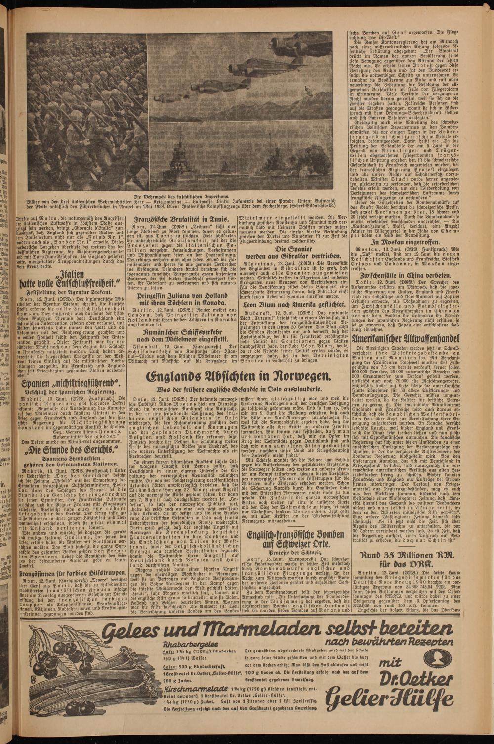 Vierten müsse Einspruch erhoben werden. Schon bie Sicherung Narviks burch die Englänber habe mit den Interessen Norwegens nichts mehr zu tun gehabt. Die Zukunft bes ganzen norwegischen Volkes noch weiter auf eine so unsichere Karte wie ben Sieg der Westmächte zu setzen, sei nicht nur Wahnsinn, sondern Verbrechen. Jetzt gelte es, mit allen Kräften an der Wiederaufrichtung Norwegens mitzuarbeiten.