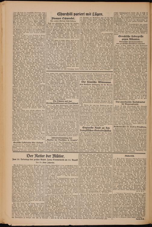 Man bleibt natürlich nicht bei der propagandistischen Lüge, sondern zieht auch das sentimentale Register. So berichtet der Einwohner einer südenglischen Stadt (die vorsichtigerweise nicht genannt wird), er habe über 50 Flugzeuge beim Angriff gezählt, es habe ausgesehen wie ein Bienenschwarm. Sehr schön, so wird es sicher gewesen fein! Und daß dieser Bienenschwarm Honig gebracht hat, ist ja wohl nicht anzunehmen. Aber nun kommt der Haken bei der Geschichte: I n einer Kjrche wären die Kinder getade beim Gottesdienst gewesen, sie hätten nun hinter einer Mauer Schutz gesucht und während des Angriffs fromme Lieder gesungen. Man versteht ohne weiteres, was mit dieser Schilderung beabsichtigt ist: der Welt soll klargemacht werden, daß die Deutschen sich natürlich ausgerechnet die Kirchzeit für den Angriff ausgesucht haben. Die Tatsachen sehen anders aus. Wenn die Engländer in diesem Augenblick ihrem Volke die große Luftniederlage von Portland so vorsetzen würden, wie sie den Tatsachen entspricht, dann wäre eine unbeschreibliche Panik die Folge. Die Furcht davon ist es, die die englische Regierung veranlaßt, ihre Zuflucht zur faustdicken Lüge zu nehmen. Aber lange wird sie sich mit solchen brüchigen Behelfsmitteln nicht über Wasser zu halten vermögen.