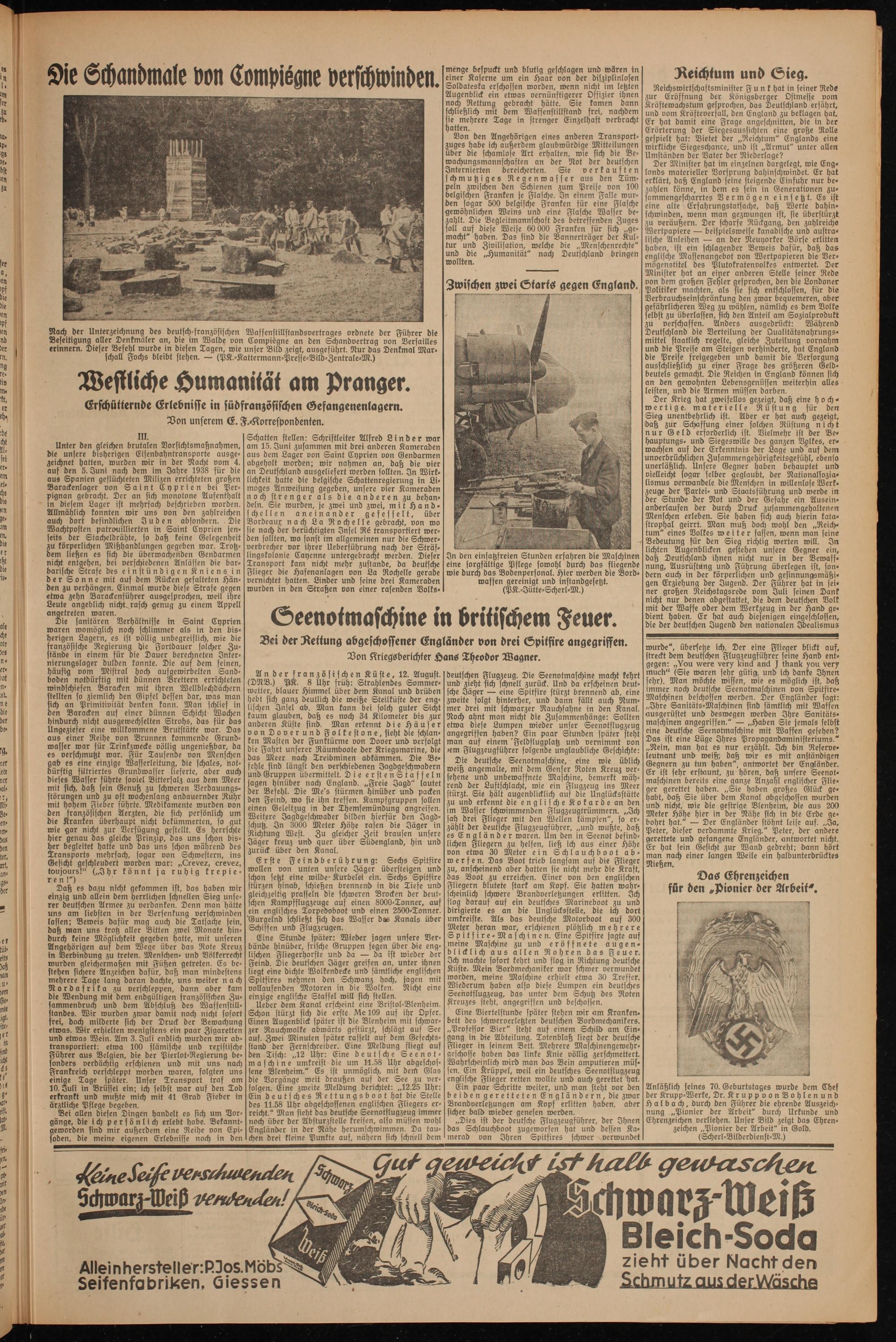 Erste Feindberührung: Sechs Spitfire wollen von unten unsere Jäger übersteigen und schon setzt eine wilde- Kurbelei ein. Sechs Spitfire stürzen hinab, schießen brennend in die Tiefe und gleichzeitig prasseln die schweren Brocken der deutschen Kampfflugzeuge auf einen 8000-Tonner, auf ein englisches Torpedoboot und einen 2500-Tonner. 'Guraelnd schließt sich das Wasser dn Kanals über Schiffen und Flugzeugen.