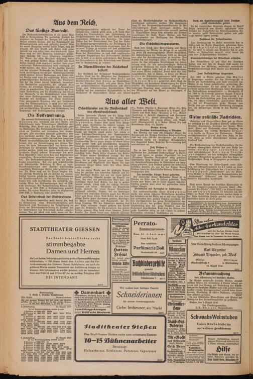 In Gießen wohnhafte deutsche Mütter, einerlei welchen Alters, die mindestens 4 Kinder lebend geboren und den Antrag auf Verleihung des Ehren- kreuzes der deutschen Mutter noch nicht gestellt haben, werden ersucht, Antragsvordruck alsbald beim Standesamt, Marktplatz 14 (Altes Rathaus), abzuholen oder abholen zu lassen. 3625C
