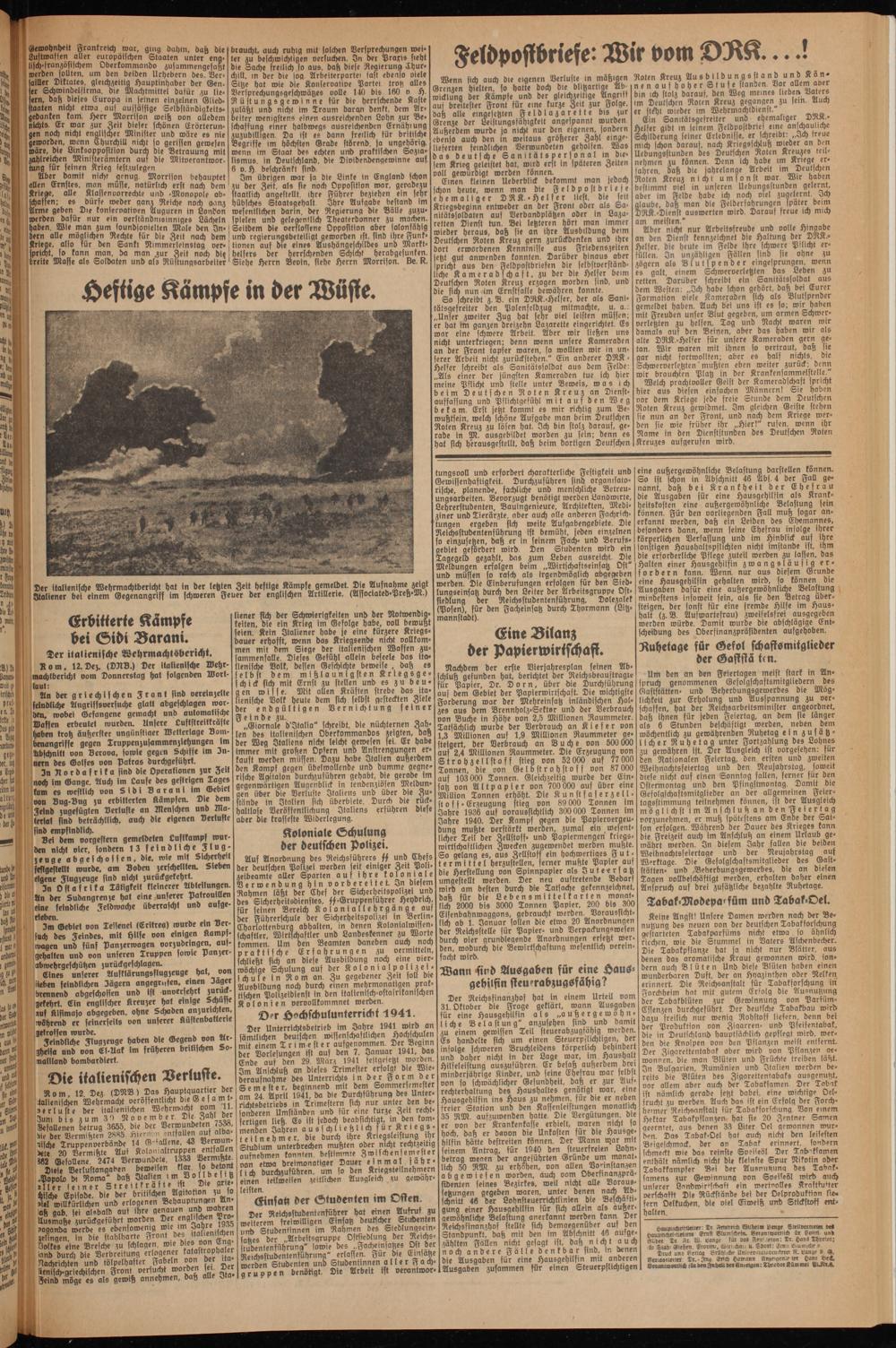 In Rordafrika find die Operationen zur Zeit noch im Gange. Auch im Laufe des gestrigen Tages kam es westlich von Sidi Barani im Gebiet von Bug-Bug zu erbitterten Kämpfen. Die dem Frind zugefügten Verluste an Menschen und Material sind beträchtlich, auch die eigenen Verluste