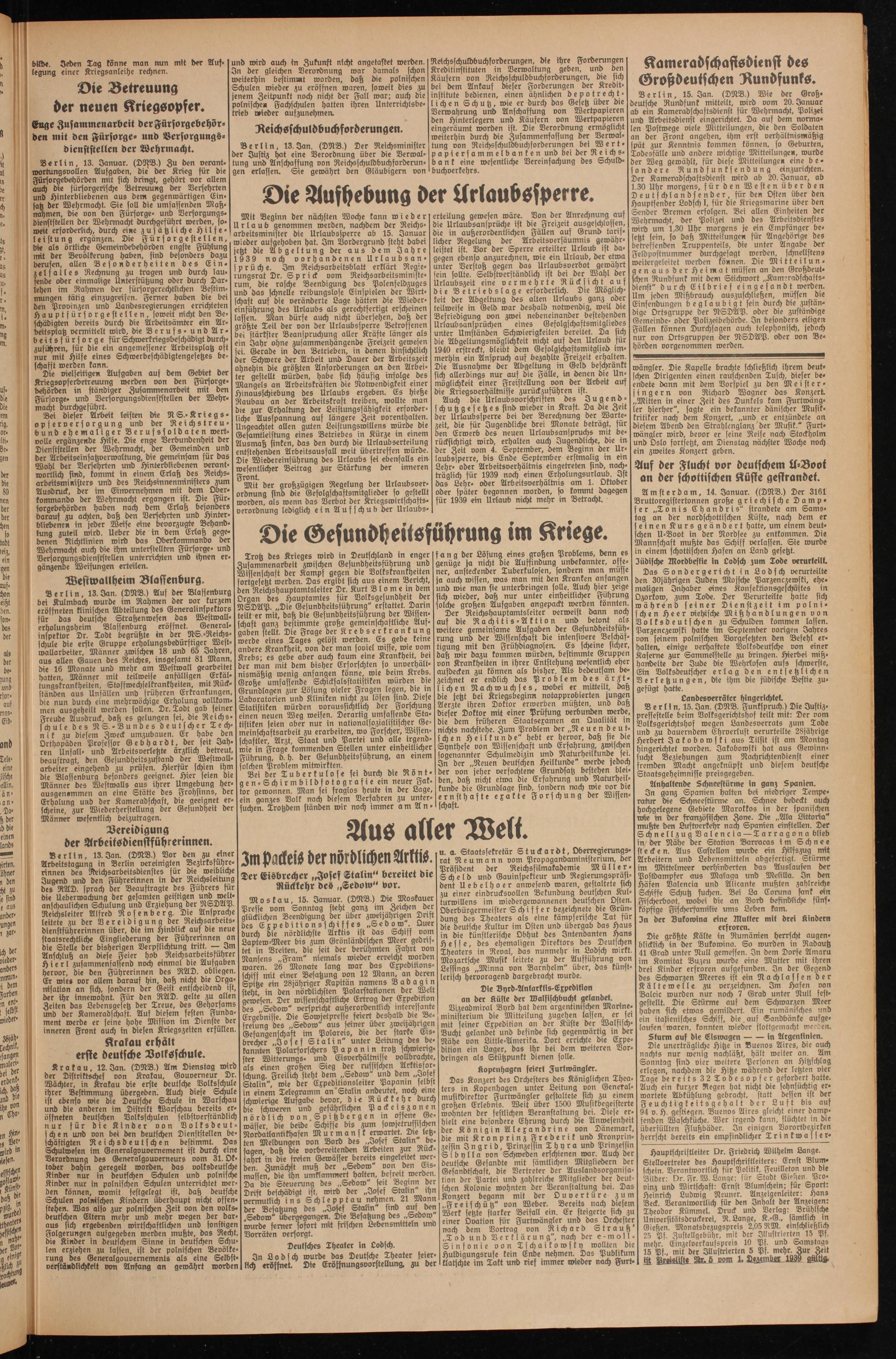 B e r l i n, 15. Jan. (DNB. Funkspruch.) Die Justiz- Pressestelle beim Volksgerichtshof teilt mit: Der vom Volksgerichtshof wegen Landesverrats zum Tode und zu dauerndem Ehrverlust verurteilte 28jährige Herbert I a k o b o w s k i aus Tilsit ist am Montag hingerichtet worden. Jakobowski hat aus Gewinnsucht Beziehungen zum Nachrichtendienst einer fremden Macht angeknüpft und diesem deutsche Staatsgeheimnisse preisgegeben.