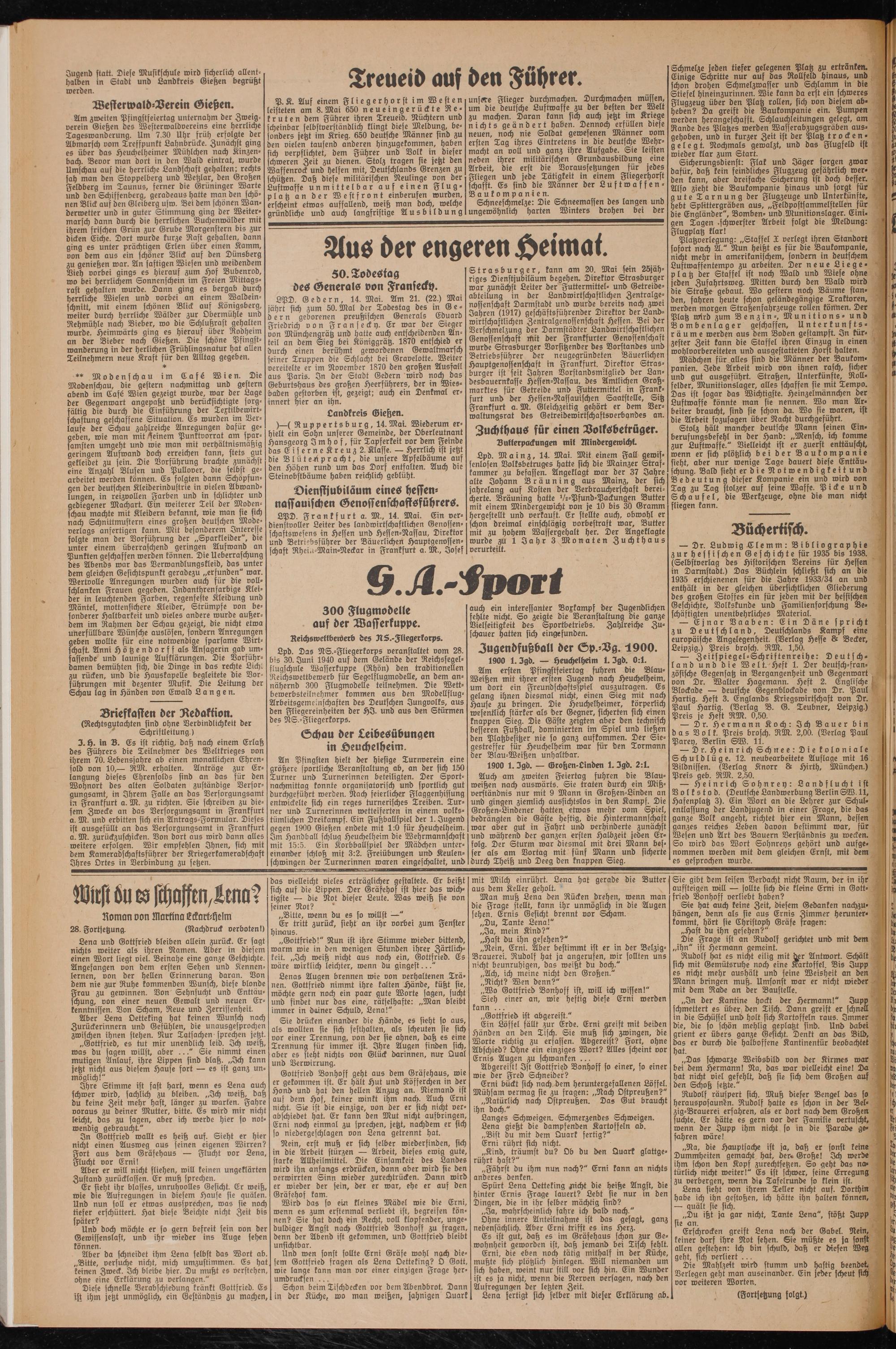 An Pfingsten hielt der hiesige Turnverein eine größere sportliche Veranstaltung ab, an der sich 150 Turner und Turnerinnen beteiligten. Der Sportnachmittag konnte organisatorisch und sportlich gut durchgeführt werden. Nach feierlicher Flaggenhissung entwickelte sich ein reges turnerisches Treiben. Turner und Turnerinnen wetteiferten in einem volkstümlichen Dreikampf. Ein Fußballspiel der 1. Jugend gegen 1900 Gießen endete mit 1:0 für Heuchelheim. Im Handball schlug Heuchelheim die Wehrmannfch-ast mit 15:5. Ein Korbballspiel der Mädchen untereinander schloß mit 3:2. Freiübungen und Keulenschwingen der Turnerinnen waren eingeschaltet, und