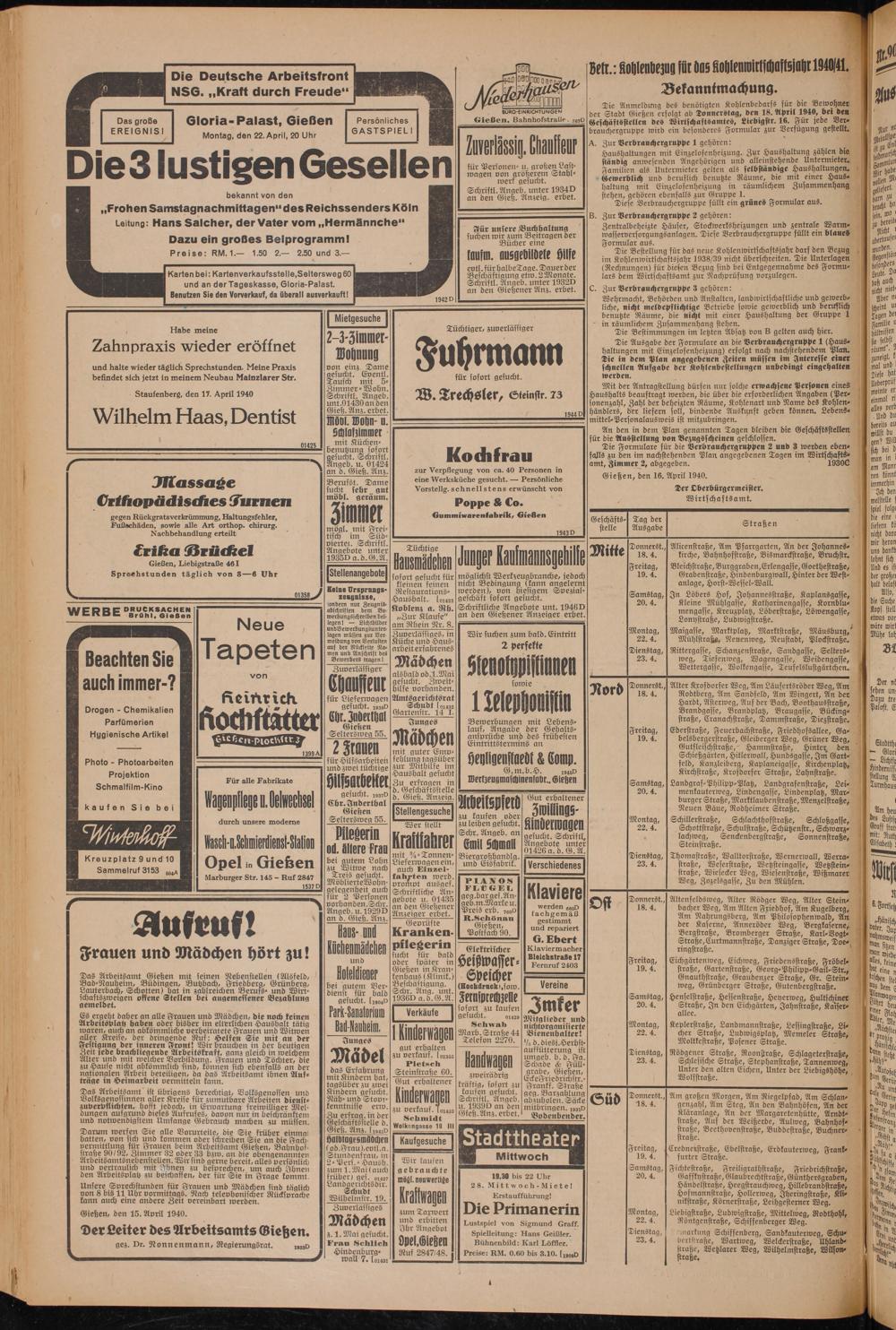 Die Anmeldung des benötigten Kohlenbedarfs für die Bewohner der Stadt Gießen erfolgt ab Donnerstag, den 18. April 1940, bei den Geschäftsstellen des Wirtschaftsamtes, Licbigstr. 1«. Für jede Verbrauchergruppe wird ein besonderes Formular zur Verfügung gestellt.