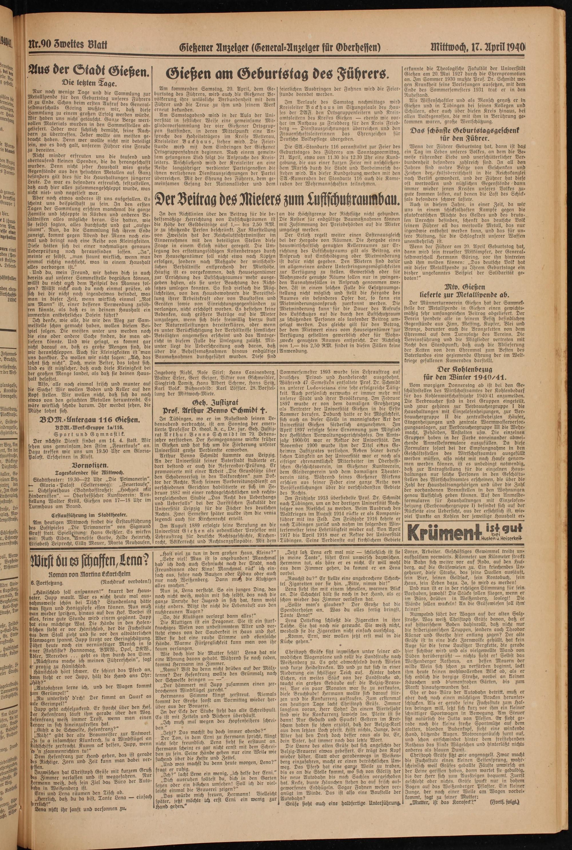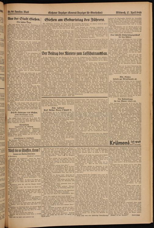 Am kommenden Samstag, 20. April, dem Geburtstag des Führers, wird auch.die Gießener Bevölkerung ihre unlösliche Verbundenheit mit dem Führer und die Treue zu ihm und seinem Werk erneut bekunden.