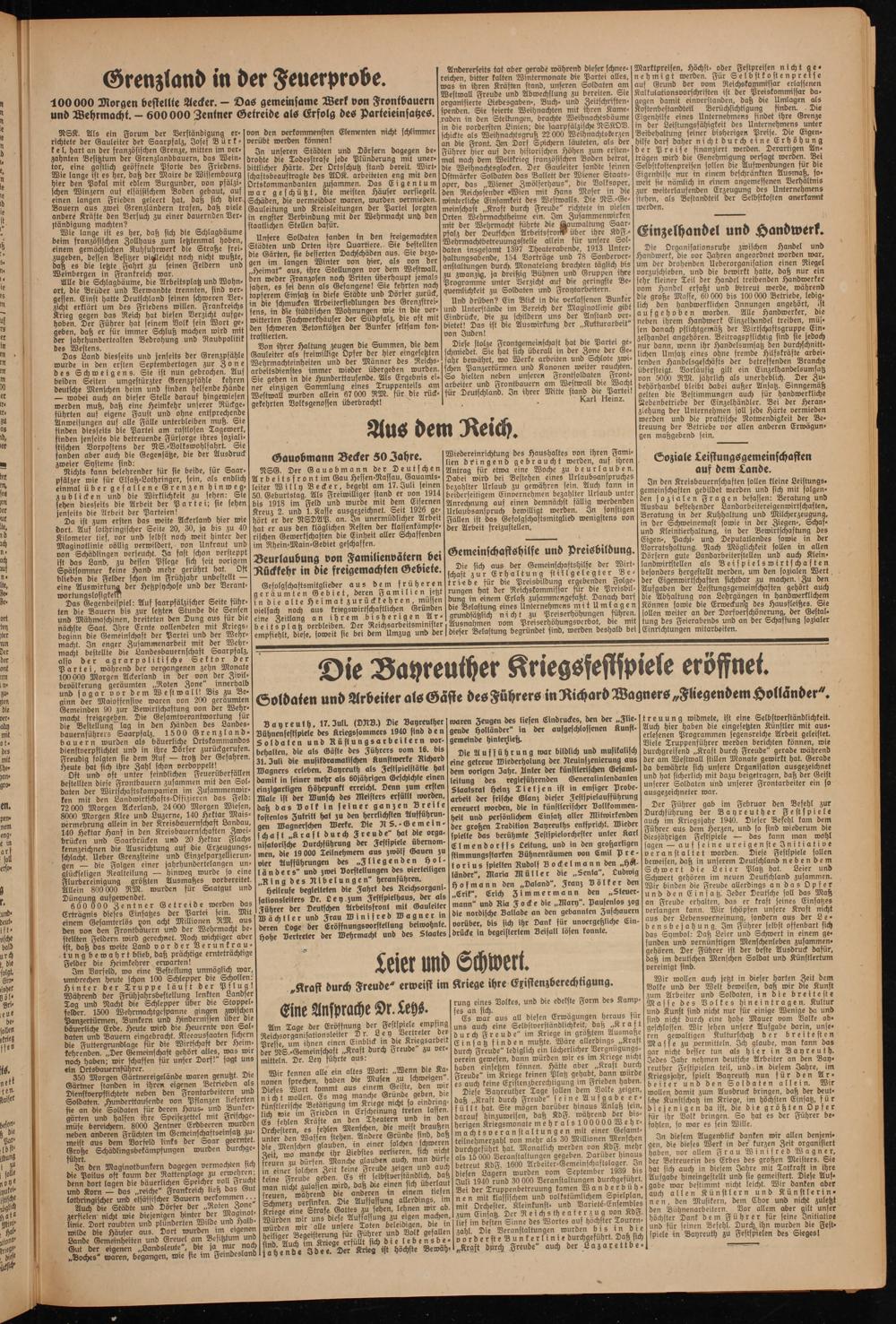 Alle bie Schlagbäume, bie Arbeitsplatz unb Wohnort, bie Brüber unb Verwanbte trennten, finb vergessen. Einst hatte Deutschlanb seinen schweren Verzicht erklärt um bes Friebens willen. Frankreichs Krieg gegen bas Reich hat biesen Verzicht aufgehoben. Der Führer hat feinem Volk fein Wort gegeben, baß er für immer Schluß machen wirb mit ber jahrhunbertealten Bedrohung unb Raubpolitik