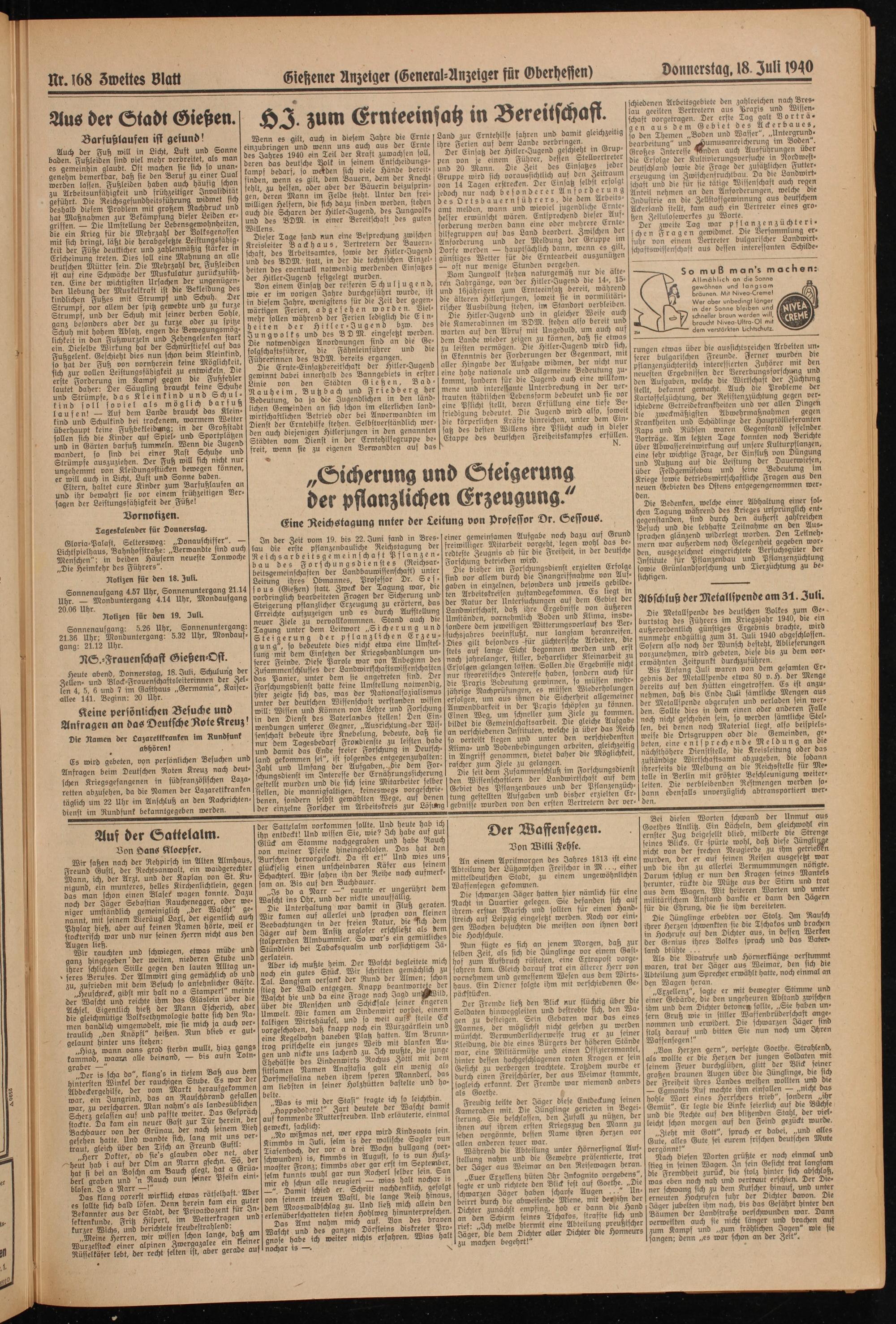 Die Metallspende des deutschen Volkes zum Geburtstag des Führers im Kriegsjahr 1940, die ein außerordentlich günstiges Ergebnis brachte wird nunmehr endgültig zum 31. Juli 1940 abgeschlossen. Sofern also noch der Wunsch besteht, Ablieferungen vorzunehmen, wird gebeten, diese bis zu dem vor» erwähnten Zeitpunkt durchzuführen.