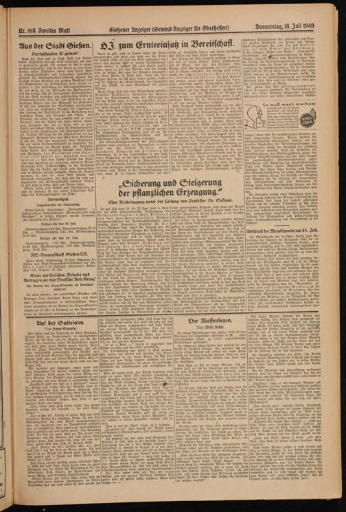 Die Ernte-Einsatzbereitschaft der Hitler-Jugend gewinnt Dabei innerhalb des Banngebiets in erster Linie von Den StüDten Gießen, DaD- Nauheim, Butzbach und Friedberg her Bedeutung, Da ja die Jugendlichen in Den ländlichen Gemeinden an sich schon im elterlichen landwirtschaftlichen Betrieb ober bei Anverwandten im Dienst der Erntehilfe stehen. Selbstverständlich werden auch diejenigen Hitlerjungen in Den genannten Städten vorn Dienst in Der Erntehilfegruppe befreit, wenn sie zu eigenen Verwandten auf das