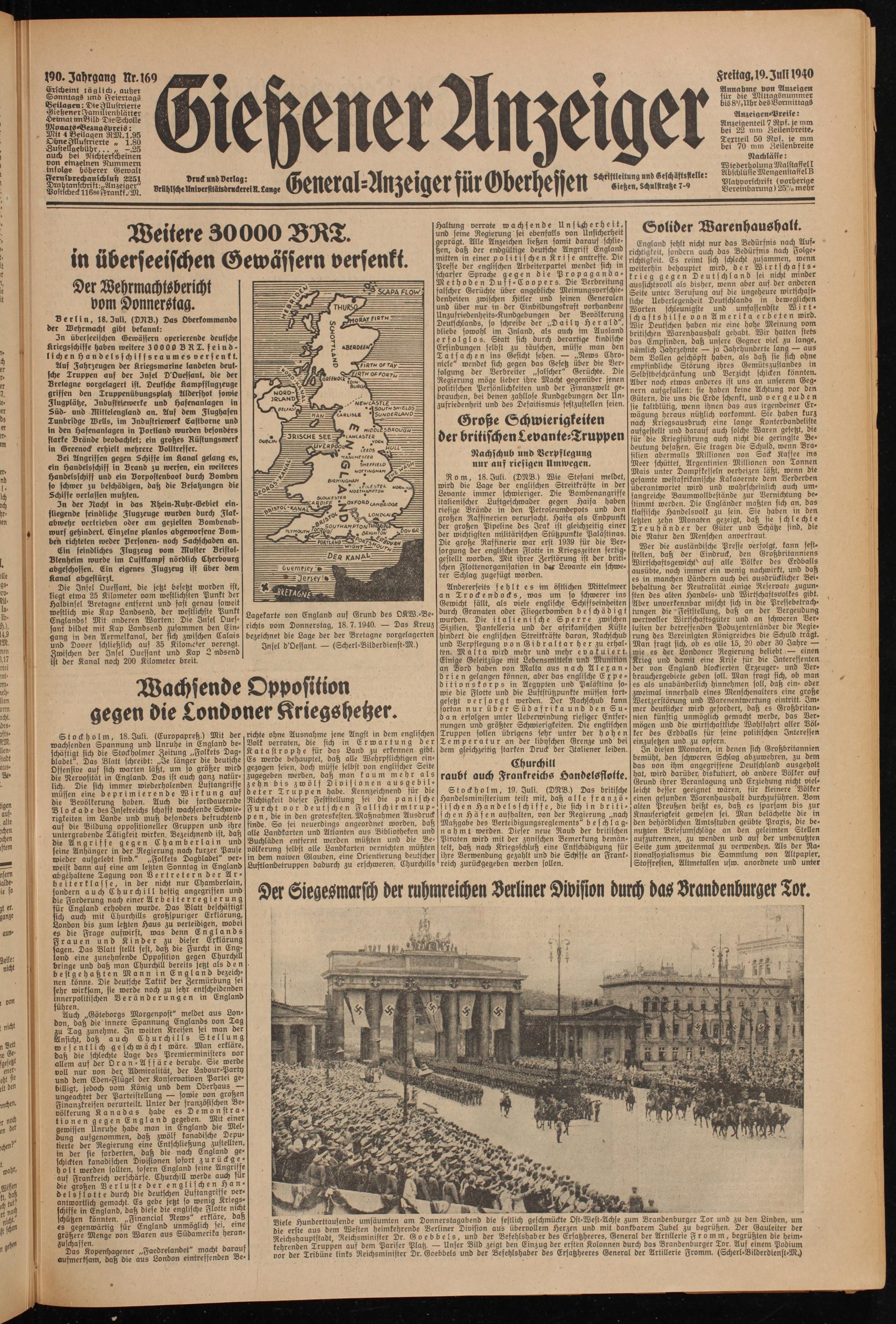 richte ohne Ausnahme jene Angst in dem englischen Volk verraten, die sich in Erwartung der Katastrophe für das Land zu erkennen gibt. Es werde behauptet, daß alle Wehrpflichtigen eingezogen seien, doch müsse selbst von englischer Seite zugegeben werden, daß man kaum mehr als zehn bis zwölf Divisionen ausgebil- leter Truppen habe. Kennzeichnend für die Richtigkeit dieser Feststellung sei die panische Furcht vor deutschen F a l l s ch i r m t r u p - p en, die in den groteskestemMaßnahmen Ausdruck inde. So sei neuerdings angeordnet worden, daß alle Landkarten und Atlanten aus Bibliotheken und Buchläden entfernt werden müßten und die Bevölkerung selbst alle Landkarten vernichten müßten in dem naiven Glauben, eine Orientierung deutscher Luftlandetruppen dadurch zu erschweren. Churchills
