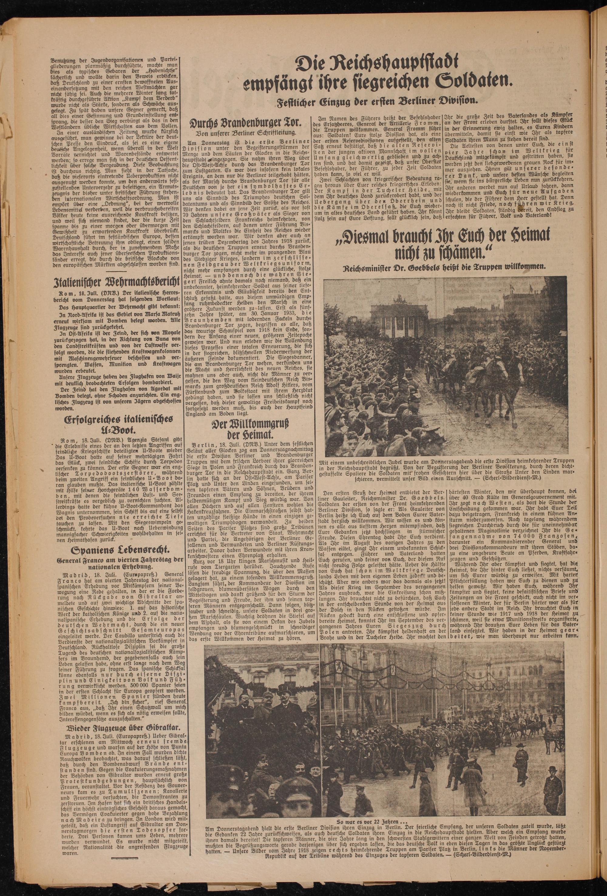 Kurz vor 18 Uhr klingen Marschmusik und Heilrufe vom Tiergarten herüber. Jauchzende Rufe lösen die freudige Spannung, die über den Massen gelagert hat, zu einem tosenden Willkommensgruß. Langsam fährt, der Kommandeur der Division im feldgrauen, blumenübersäten Wagen durch den Mittelbogen und dankt grüßend für den Sturm der Begeisterung und Freude, der ihm und seinen tapferen Männern entgegenschallt. Dann folgen, blitz- auber und schneidig, unsere Soldaten in drei gro- 3en Marschsäulen. Wuchtig dröhnen die Stiefel auf dem Asphalt, als sie von einem Orkan des Jubels empfangen und blumengeschmückt in schneidiger Wendung vor der Ehrentribüne aufmarschieren, um das erste Willkommen der Heimat zu hören.