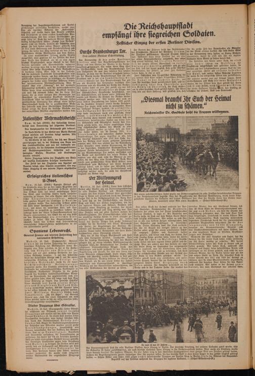 Während Ihr aber kämpftet und siegtet, hat diej Heimat, die Ihr hinter Euch ließet, nichts versäumt« um sich Eurer mürbig zu erweisen. Mit harter Pflichterfüllung haben wir Euch zu dienen und zu! helfen gewußt. Wir haben Euch, während Ihr kämpftet und siegtet, keine defaitiftischen Briefe und Zeitungen an die Front geschickt, auch nicht im verflossenen Winter, der für Berlin härter war als für jede andere Stadt im Reich. Ihr brauchtet Euch im keiner Stunde wie 1917 und 1918 der Heimat zu! schämen, weil sie ebner Munitionsstreiks organisierte, während Ihr draußen Euer Leben für das Vaterland einsetztet. Wir haben in der Heimat gearbeitet, wie man überhaupt nur arbeiten kaum