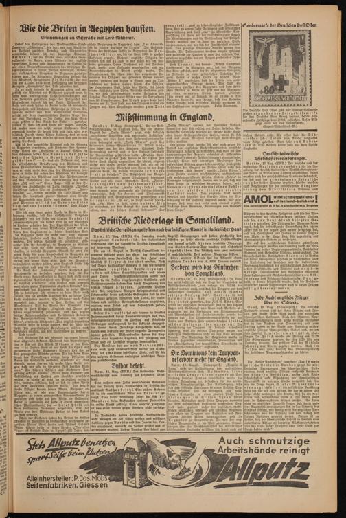 Unsere Luftwaffe hat wie immer in direkter Zusammenarbeit durch Bombardierungen und Wa- schinengewehrangriffe im Tiefflug auf feindliche Stellungen wirkungsvoll in die Schlacht eingegriffen sowie durch Fernflüge Kriegsschiffe und im Hafen von Berbera vor Anker liegende Transporter schwer getroffen. Währenddessen haben die Engländer ohne irgendein Ergebnis den Flugplatz von Assab und die Ortschaft Giggiga bombardiert.