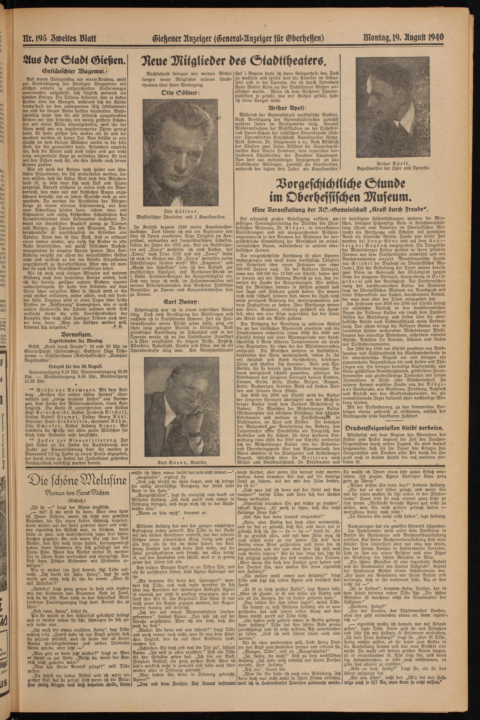 In Krefeld begann 1926 meine Kapellmeisterlaufbahn. Dort konnte ich mir ein Repertoire von über 50 Opern erarbeiten. Rege Tätigkeit im Konzertsaal, verbunden mit kompositorischem Schaffen, füllten die Jahre bis 1935 aus. Auf ein Gastdirigie- ren mit „Tosca" wechselte ich nach Aachen, mit „Tosca" nach Trier 1939 und mit „Tosca" stellte ich mich in Gießen vor. Ob „Tosca" weiterhin meine Schicksalsoper bleiben wird? Mit „Paganini" und „Macht des Schicksals" leite ich den Auftakt zur musikalischen Spielzeit, mit Beethoven-Abend im 1. Städt. Sinfonie-Konzert die Konzerttätigkeit ein. Und nun freue ich mich, im Zusammenwirken mit meinen Arbeitskameraden dem Gießener Publikum Vermittler zu Opern- und Konzerterlebnissen sein zu können.