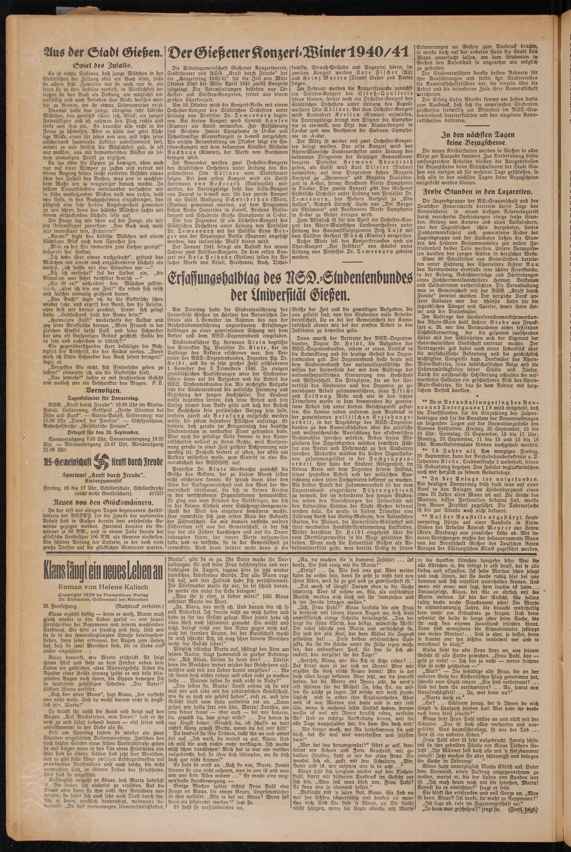 Die Arbeitsgemeinschaft Gießener Konzertverein, Stadtttzeater und NSG. „Kraft durch Freude" hat als „Konzertring 1940/41" für die Zeit von Mitte Oktober 1940 bis Mitte April 1941 zwölf Konzerte festgelegt. Die Veranstaltungen bestehen aus Orchester- und Soliften-Konzerten, ferner aus einem großen Chorkonzert.