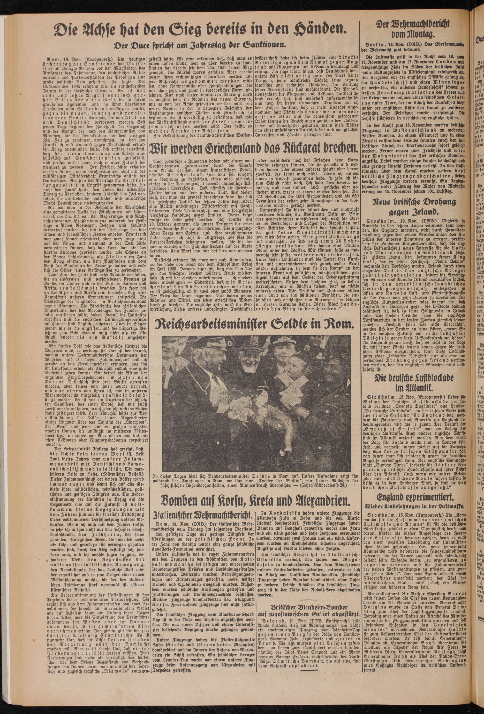 Die Luftwaffe griff in der Nacht vom 18. znw 17. November und am 17. November London und kriegswichtige Ziele im Süden der britischen Insel sowie Rüstungsziele in Mittelengland erfolgreich au. Im Seegebiet vor der englischen Ostküste gelang es, ein Handelsschiff und einen Minenleger zu versenken, ein anderes Handelsschiff schwer zu treffen. Fernkampfbatterien des Heeres und der Kriegsmarine nahmen einen feindlichen Geleit- z u g unter Feuer, der im Schuh der Dunkelheit dicht unter der englischen Küste den Kanal zu passieren versuchte. Der Geleitzug wurde zersprengt. Die Schiffe flüchteten in verschiedene englische Häsen.