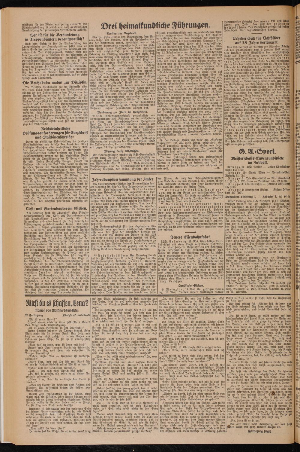 Unter Leitung von Schiedsrichter Post (Gießen- Wieseck) standen sich am gestrigen Sonntag auf. dem Sportplatz an der Neumühle beide Mannschaften im Kriegsmeisterschaftsspiel gegenüber. Die Gästemannschaft hinterlieh einen guten Eindruck. Unbefangen und mit dem starken Wind im Rücken spielend, blieben die Rodheimer im Angriff und zur Ueberraschung der Zuschauer führten die Gäste bald 1:0. Als jedoch die Teutonen dazu übergingen, den Ball flach zu halten, kamen sie mehr und mehr zur Geltung. Auf gute Vorlage von Harnisch erzielte der Halbrechte Arnold den Ausgleich. Nicht lange dauerte es und der gleiche Spieler verwandelte eine Vorlage von Schmitt zum 2. Treffer. Dann ging Harnisch auf Linksaußen durch und schoß hart auf das Tor. Der Gästetorhüter vermochte den Ball nur abzulenken, Arnold war zur Stelle und schon hieß es 3:1. Eine weitere Kombination des einheimischen Sturmes schloß Arnold mit dem vierten Treffer ab.