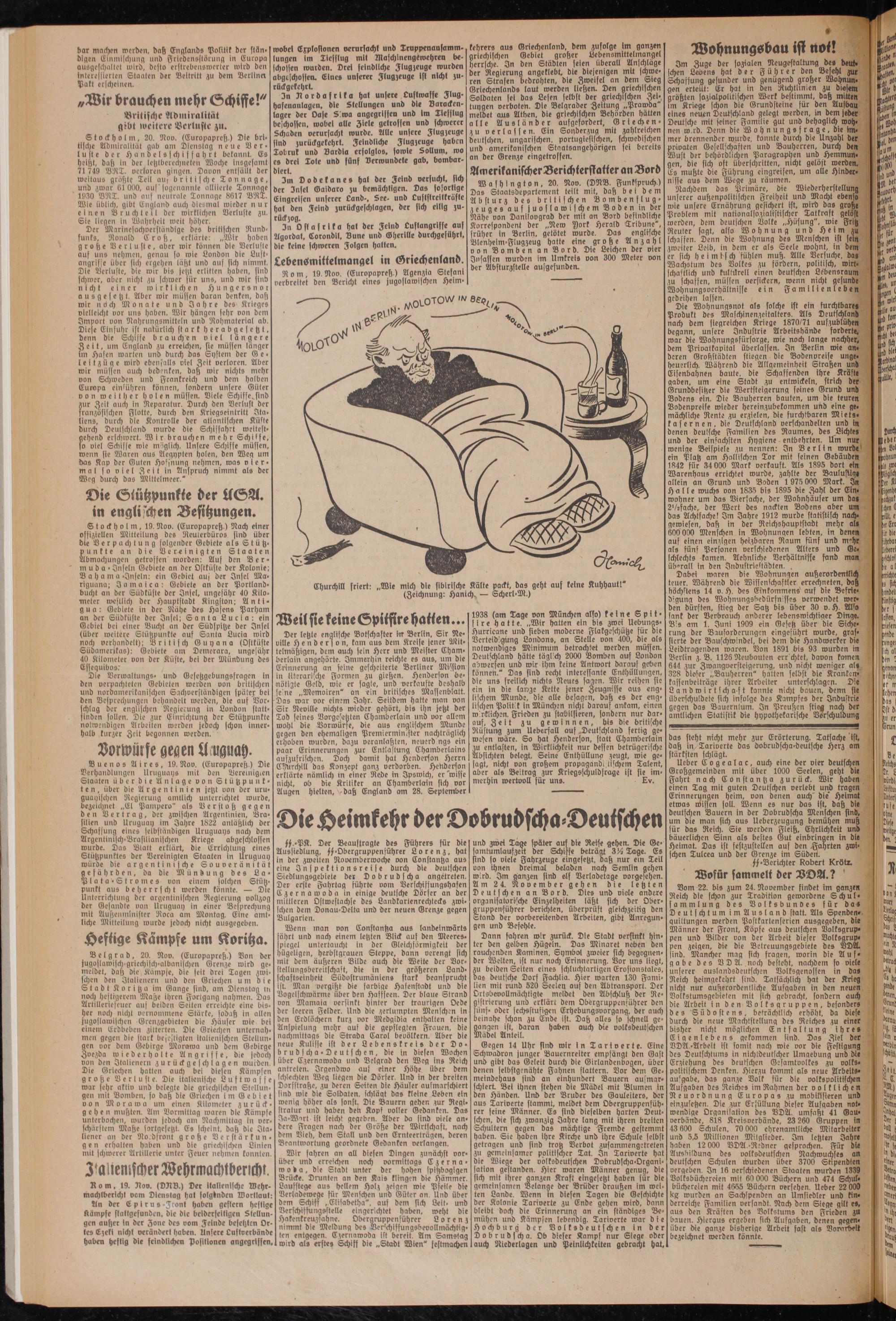 Der Marinesachoerstandige des britischen Rundfunks, Ronald Croß, erklärte: „Wir haben große Verluste, aber wir können die Verluste auf uns nehmen, genau so wie London die Lust- angriffe über sich ergehen läßt und auf sich nimmt. Die Verluste, die wir bis jetzt erlitten haben, sind schwer, aber nicht zu schwer für uns, und wir sind nicht einer wirklichen Hungersnor ausgesetzt. Aber wir müssen daran denken, daß wir ii d d) Monate und Jahre des Krieges viclleid)t vor uns haben. Wir hängen sehr von dem Import von Nahrungsmitteln und Rohmaterial ab. Diese Einfuhr ist natürlich stark herabgesetzt, denn die Schiffe brauchen viel längere Zeit, um England zu erreid;en, sie müssen länger im Hafen warten und durch das System der Gele itzüge wird ebenfalls viel Zeit verloren. Aber wir müssen auch bedenken, daß wir nid)ts mehr von Sd)wedcn und Frankreich und dem halben Europa einiühren können, sondern unsere Güter von weither holen müssen. Diele Schiffe, sind aur Zeit auch In Reparatur. Durd) den Verlust der französischen Flotte, durd) den Kriegseintritt Italiens, durch die Kontrolle der atlantischen Küste durch Deutschland wurde die Schiffahrt weitestgehend erschwert. Wir brauchen mehr Schilfe, so viel Schiffe wie möglich. Unsere Schiffe müssen, wenn sie Waren aus Aegypten holen, den Weg um das Kap der Guten Hoffnung nehmen, was viermal so viel Zeit in Anspruch nimmt als der Weg durd) das Mittelmeer."