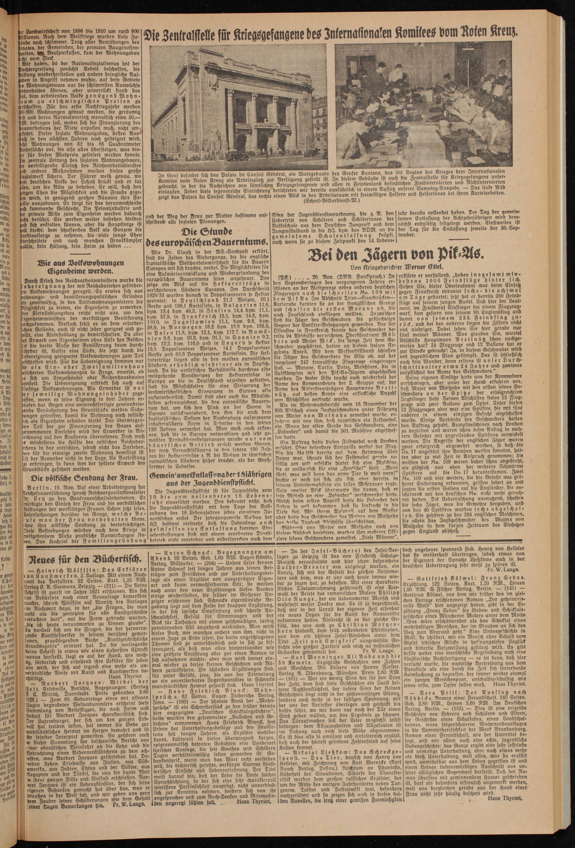 erklärte er vorstellend, „haben insgesamt mindest e n s 1 000 Feindslüge hinter sich Sehen Sie, dieser Oberleutnant war beim Einsatz gegen Frankreich mitunter sechs- bis achtmal am Tage gestartet: jetzt hat er bereits 280 Feindflüge auf feinem jungen Buckel. Und hier der Leutnant, im Zivilberuf Einflieger bei einem Flugzeug- werk, kam gestern von seinem 90. Englandflug und damit von seinem 23 5. Feindflug zurück, und bei den anderen liegen die Ziffern nicht viel niedriger. Dabei sehen Sie hier gerade nur fünf meiner Männer. Was glauben Sie, wieviel Abschüsse Hauptmann B r e t t n ü tz schon nachgewiesen hat? 2.4 Flugzeuge und 12 Ballone hat er zur Strecke gebracht! Ja, in diesem Geschwader wird mit jugendlichem (Elan getämpft Das ist schließlich auch kein Wunder, denn erstens ist unser Durch- schnittsalter etwa 24 Jahre und zweitens verpflichtet der Name des Geschwaders."
