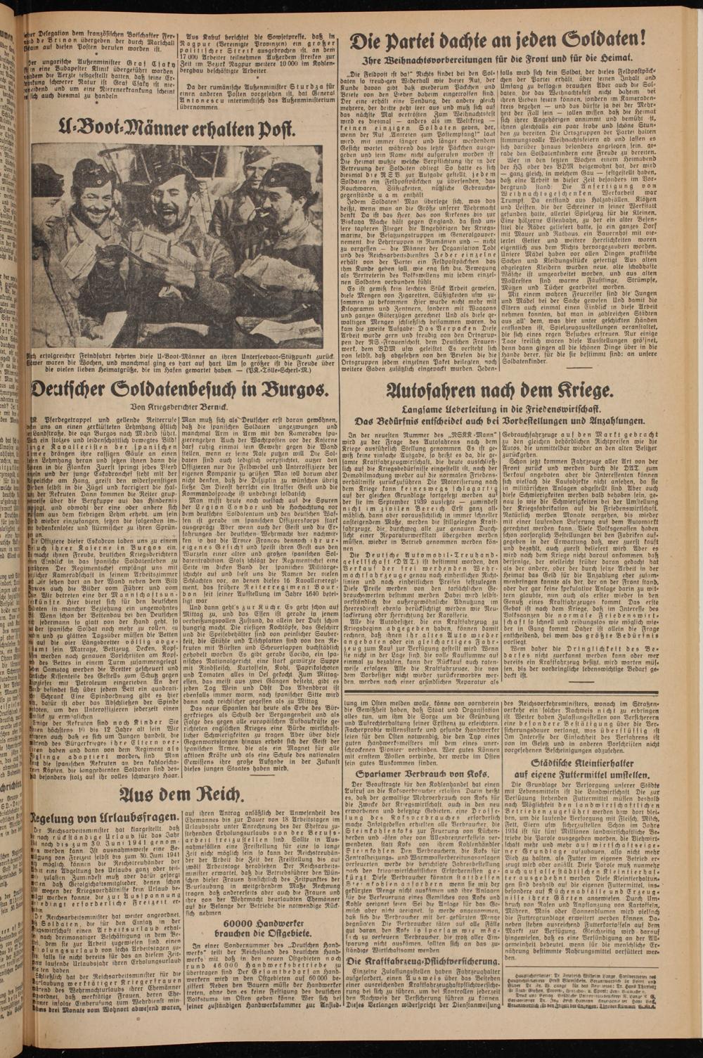 Jedem Soldaten' Man überlege sich, was das beißt, wenn man an die Größe unserer Wehrmacht denkt Da ist das Heer. Das von Kirkenes bis zur Biskaya Wache hält gegen England, da sind untere tapferen Flieger Die Angehörigen der Kriegsmarine, die Befatzungstruppen im Generalgouvernement die Lehrtruppen m Rumänien und — nicht zu vergeßen — die Männer der Organisation Todt und des ReichsarbeitsDienftes Feder einzelne erhält von der Partei ein Feldpostpäckchen das ihm Kunde gehen foU. wie eng sich die. Bewegung als Vertreterin des Volkswillens mit jedem einzelnen Soldaten verbunden fühlt