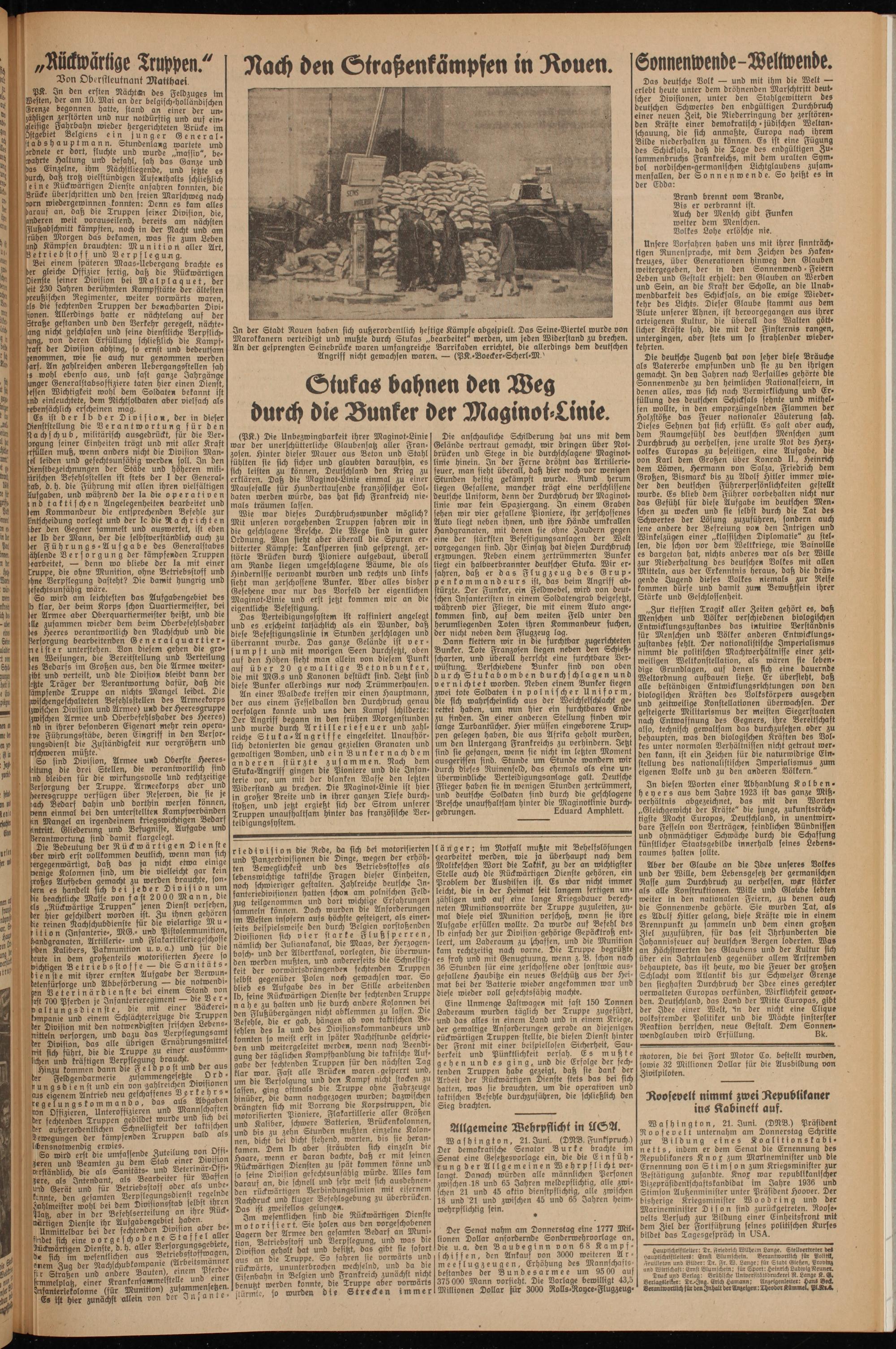 Das deutsche Volk — und mit ihm die Welt — erlebt heute unter dem dröhnenden Marschtrftt beut- eher Divisionen, unter den Stahlgewittern des deutschen Sck)wertes den enbgültigen Durchbruch einer neuen Zeit, die Nieberringung ber zerstören- den Kräfte einer demokratisch • jüdischen Weltan- chauung, die sich anmaßte, Europa nach ihrem Bilde niederhalten zu können. Es ist eine Fügung des Schicksals, daß die Tage des endgültigen Zu- ammenbruchs Frankreichs, mit dem uralten Symbol nordischen-germanischen Lichtglaubens zusam- menfallen, der Sonnenwende. So heißt es in ber Ebba: