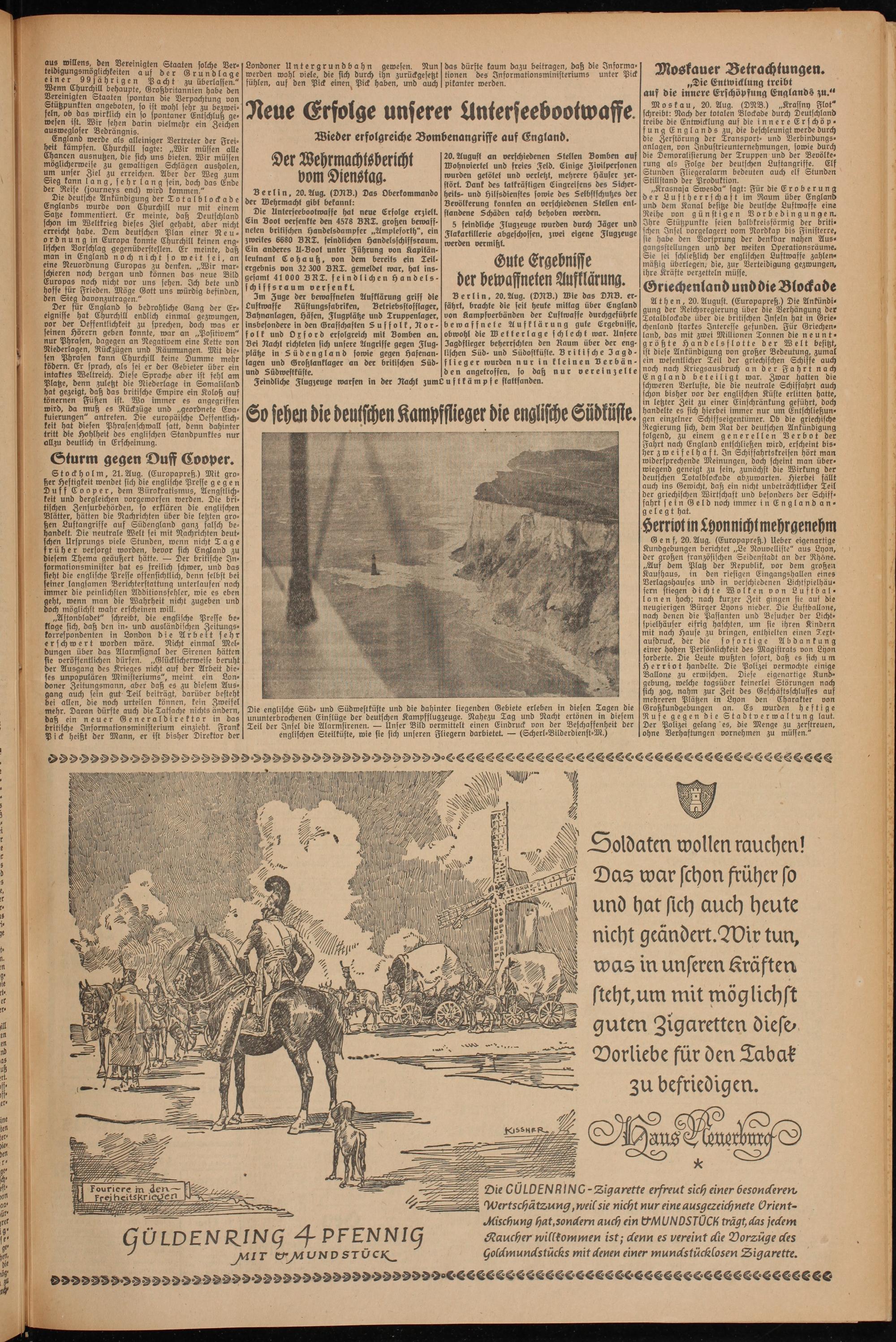 Berlin, 20.Aug. (DNB.) Wie das DNB. erfährt, brachte die seit heute mittag über England von Kampfverbänden der Luftwaffe durchgeführte bewaffnete Aufklärung gute Ergebnisse, obwohl die Wetterlage schlecht war. Unsere Jagdflieger beherrschten den Raum über der englischen Süd- und Südostküste. Britische Jagd