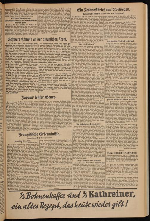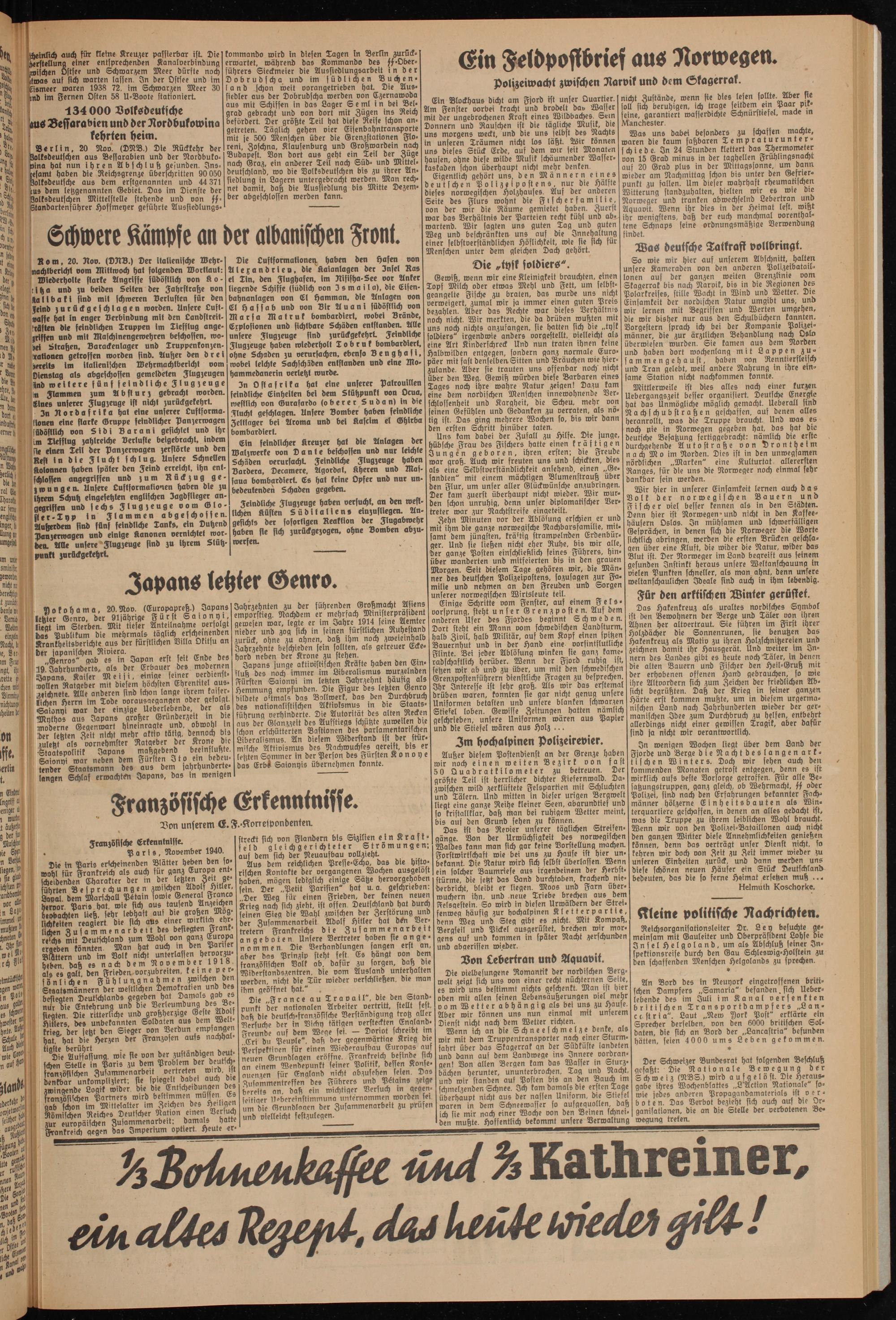 Das Hakenkreuz als uraltes nordisches Symbol ist den Bewohnern der Berge und Täler von ihren Ahnen her altoertraut. Sie führen im First ihrer Holzdächer die Sonnenrunen, sie benutzen das Hakenkreuz als Motiv zu ihren Holzschnitzereien und zeichnen damit ihr Hausgerät. Und weiter im Innern des Landes gibt es heute noch Täler, in denen die allen Bauern und Fischer den Heil-Gruß mit der erhobenen offenen Hand gebrauchen, fo wie ihre Altvordern sich zum Zeichen der friedlichen Absicht begrüßten. Daß der Krieg in seiner ganzen Härte erst kommen muhte, um in diesem urgermanischen Land nach Jahrhunderten wieder der germanischen Idee zum Durchbruch zu halfen, entbehrt allerdings nicht einer gewissen Tragik, aber dafür sind ja nicht wir verantwortlich.