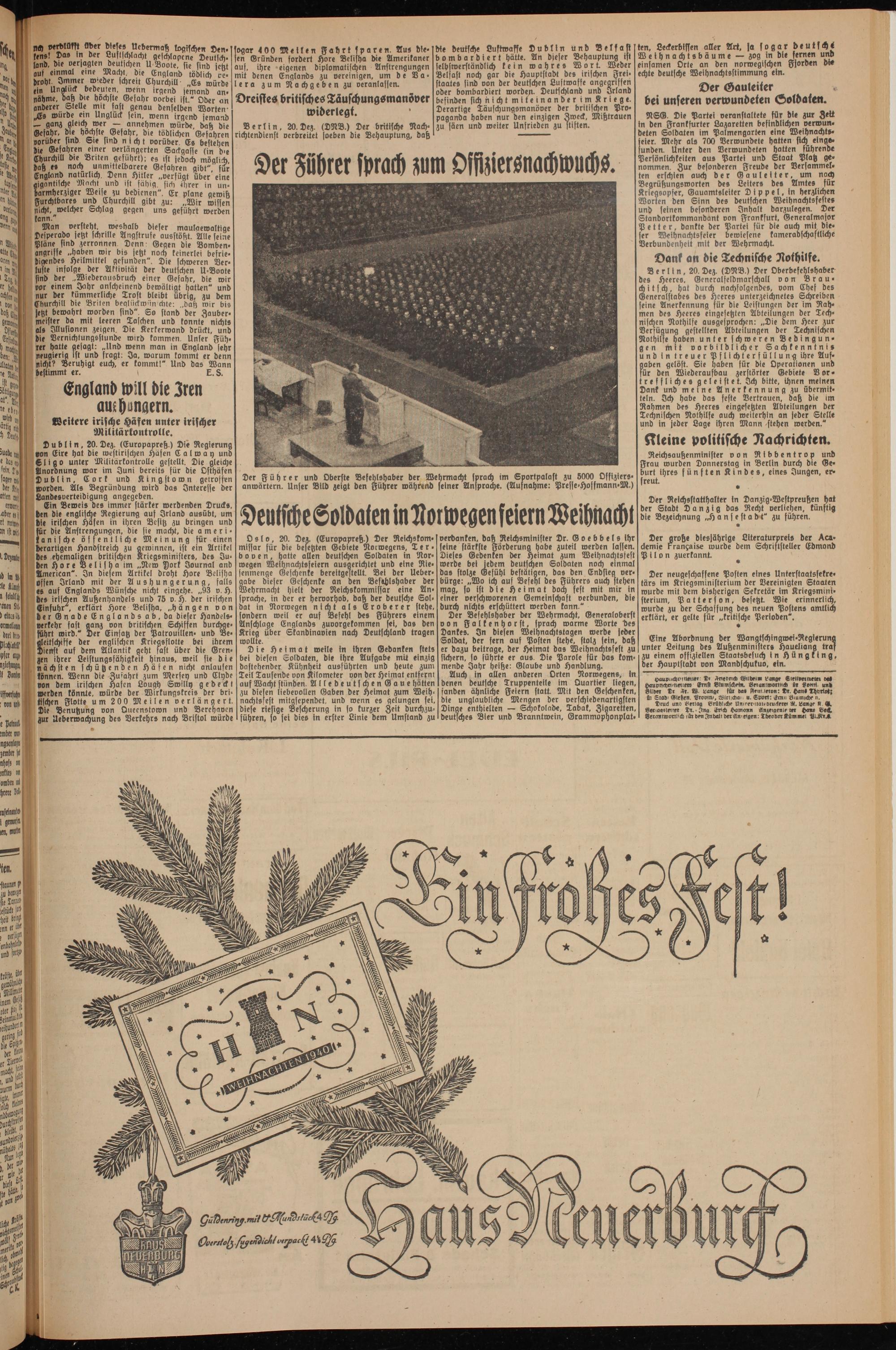 Der Befehlshaber der Wehrmacht. Generaloberst von Falkenhorst, sprach warme Worte des Dankes. In diesen Weihnachtstagen werde jeder Soldat, der fern auf Posten stehe, stolz sein, daß er dazu beitrage, der Heimat das Weihnachtsfest zu sichern, so führte er aus. Die Parole für das kommende Jahr heiße: Glaube unb Handlung.