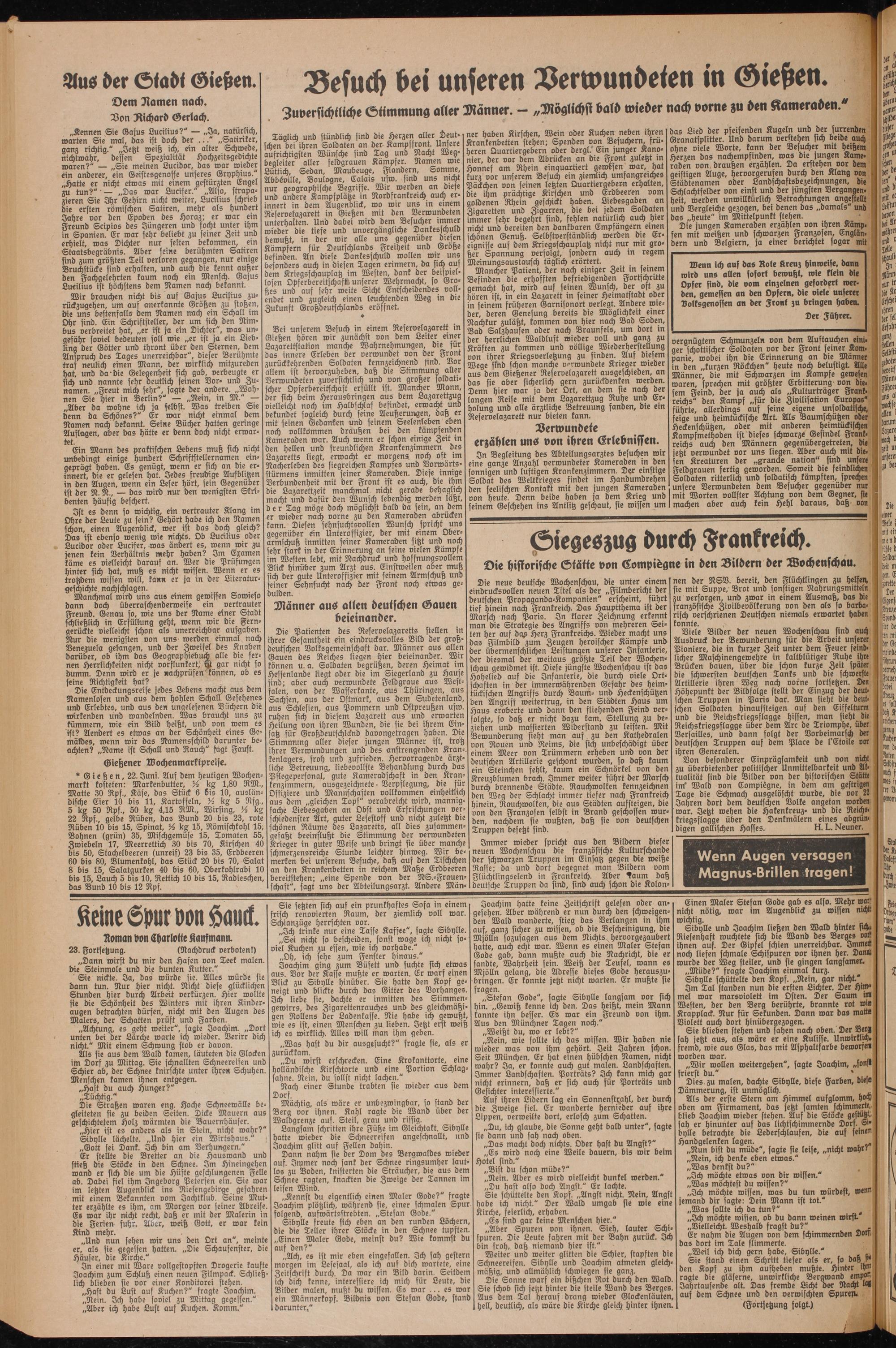Täglich und stündlich sind die Herzen aller Deut- schen bei ihren Soldaten an der Kamvffront. Unsere aufrichttgsten Wünsche sind Tag und Nacht Weg- begleiter aller feldgrauen Kämpfer. Namen wie Lüttich, Sedan, Maubeuge, Flandern, Somme, Abbeville, Boulogne, Calais usw. sind uns nicht nur geographische Begriffe. Wir werden an diese und andere Kampfplätze in Nordfrankreich auch erinnert in dem Augenblick, wo wir uns in einem Reservelazarett in Gießen mit den Verwundeten unterhatten. Und dabei wird dem Besucher immer wieder die tiefe und unvergängliche Dankesschuld bewußt, in der wir alle uns gegenüber diesen Kämpfern für Deutschlands Freiheit und Größe befinden. An diese Dankesschuld wollen wir uns besonders auch in diesen Tagen erinnern, da sich auf dem Kriegsschauplatz im Westen, dank der beispiellosen Opferbereitschaft'unserer Wehrmacht, so Großes und auf sehr weite Sicht Entscheidendes vollendet und zugleich einen leuchtenden Weg in die Zukunft Großdeutschlands eröffnet.
