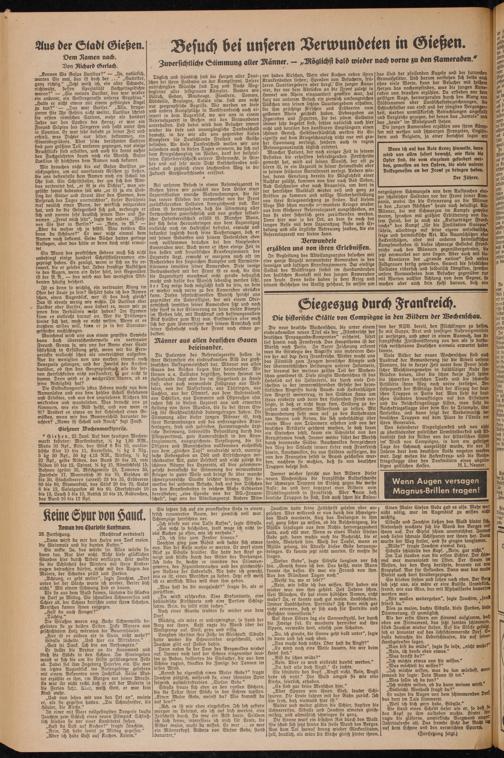 Bei unserem Besuch in einem Reservelazarett in Gießen hören wir zunächst von dem Leiter einer Lazarettstation manche Wahrnehmungen, die für das innere Erleben der verwundet von der Front zurückkehrenden Soldaten kennzeichnend sind. Vor allem ist hervorzuheben, daß die Stimmung aller Verwundeten zuversichtlich und von großer soldatischer Opferbereitschaft erfüllt ist. Mancher Mann, der sich beim Herausbringen aus dem Lazarettzug vielleicht noch im Halbschlaf befindet, erwacht und bekundet sogleich durch seine Äußerungen, daß er mit seinen Gedanken und seinem Seelenleben eben noch vollkommen draußen bei den kämpfenden Kameraden war. Auch wenn er schon einige Zeit in den hellen und freundlichen Krankenzimmern des Lazaretts liegt, erwacht er morgens, noch oft im Nacherleben des siegreichen Kampfes und Vorwärts- türmens inmitten seiner Kameraden. Diese innige Verbundenheit mit der Front ist es auch, die chm die Lazarettzeit manchmal nicht gerade behaglich macht und dafür den Wunsch lebendig werden läßt, der Tag möge doch möglichst bald da sein, an dem er wieder nach vorne zu den Kameraden abrücken kann. Diesen sehnsuchtsvollen Wunsch spricht uns gegenüber ein Unteroffizier, der mit einem Oberarmschuß inmitten seiner Kameraden sitzt und noch sehr stark in der Erinnerung an seine vielen Kämpfe im Westen lebt, mit Nachdruck und hoffnungsvollem Blick hinüber zum Arzt aus. Einstweilen aber muß sich der gute Unteroffizier mit seinem Armschuß und seiner Sehnsucht nach der Front noch etwas gedulden.